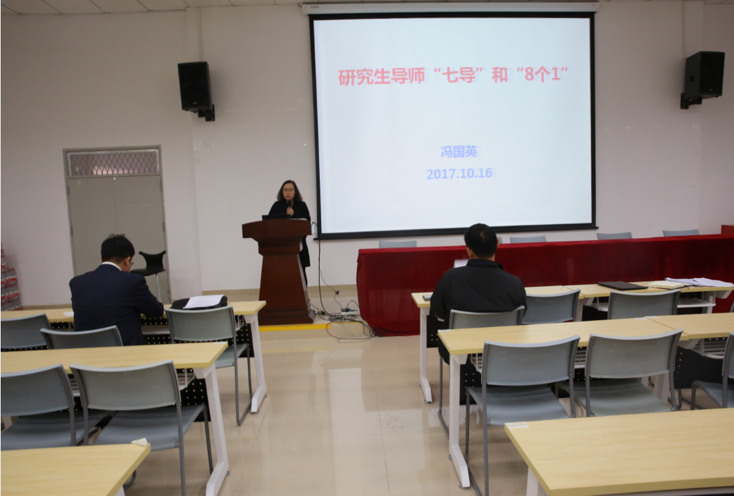 之后,冯国英院长以“研究生导师‘七导’和‘8个1’”为主题进行了讲话。她详细剖析了“以‘七导’职责细化导师指导过程”的内容,对导师们提出了相应的要求和建议,并深入讲解了研究生导师关爱学生要怎样做到“8个1”的内容。