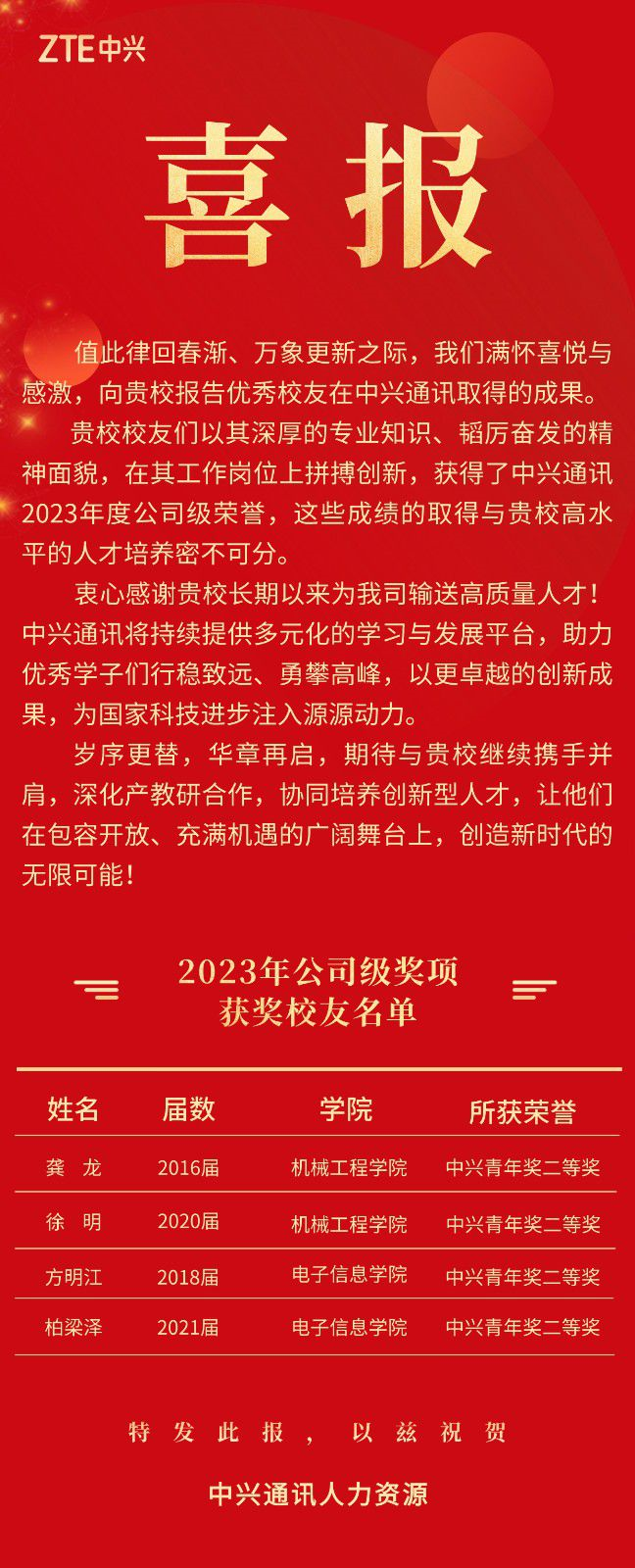 近日,学校收到中兴通讯发来的喜报,对获得中兴通讯2023年度公司级荣誉的优秀校友进行通报,并感谢学校为公司输送的高质量人才。其中,我院2018届硕士毕业生方明江、2021届硕士毕业生柏梁泽都荣获中兴青年奖二等奖。