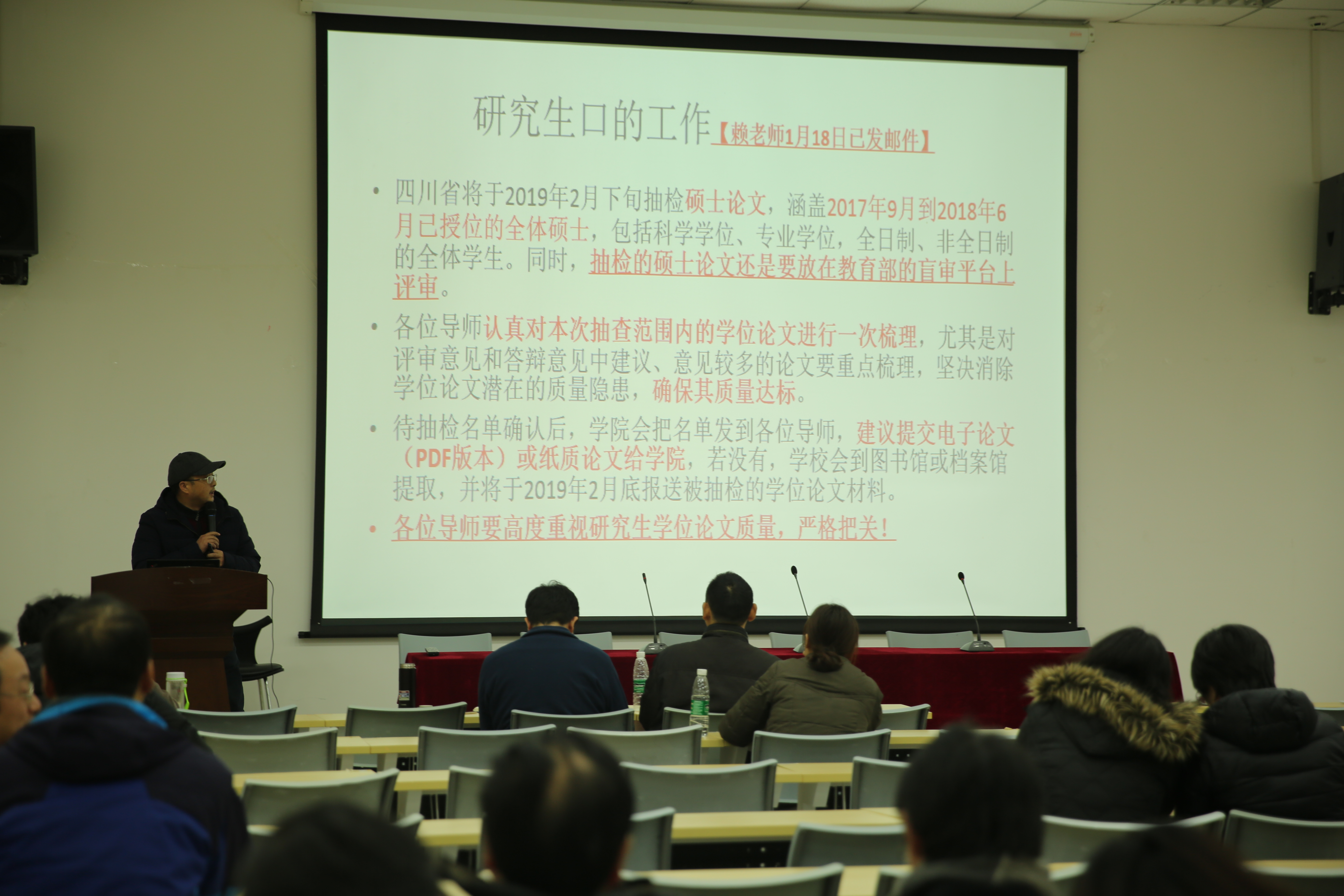 张启灿副院长向全体教职工传达了研究生工作近期安排,对下学期硕士论文抽检工作进行了重点讲解,要求全体导师认真落实该项工作,把好硕士论文的质量关。