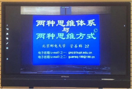 接着,学院特邀的北京邮电大学管善群教授线上作报告。作为中国声学学会与中国电子学会会士,跨越科学与艺术的电声学专家与教育家,中国立体声事业科学与艺术相结合的提倡者和促进者,管教授从科学与艺术相结合的高度作了专题报告《两种思维体系与两种思维方式》。管教授指出,科学家是理性思维,艺术家是感性思维,二者有各自问题的实质和解决办法,管教授通过深入浅出的案例告诉大家,他发现两种思维体系:理性思维与感性思维-两种思维与语言各司其职分工合作,辩证统一,是认识和研究的关键;两种思维方式:正向思维与负向思维-两种思维方式导致不同处置事务趋向,正向思维获得正能量的源泉,负向思维产生负能量的必然。管教授围绕科学与艺术的交叉思维,分享交流自己的研究,从而强调研究者应该兼具两种思维,具有跨学科意识。