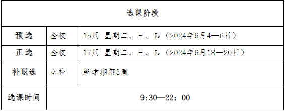 (1)正选阶段学生需上网查看是否中选预选时所选课程。正选结束后的课表为正式课表。本阶段同时进行教材选定。