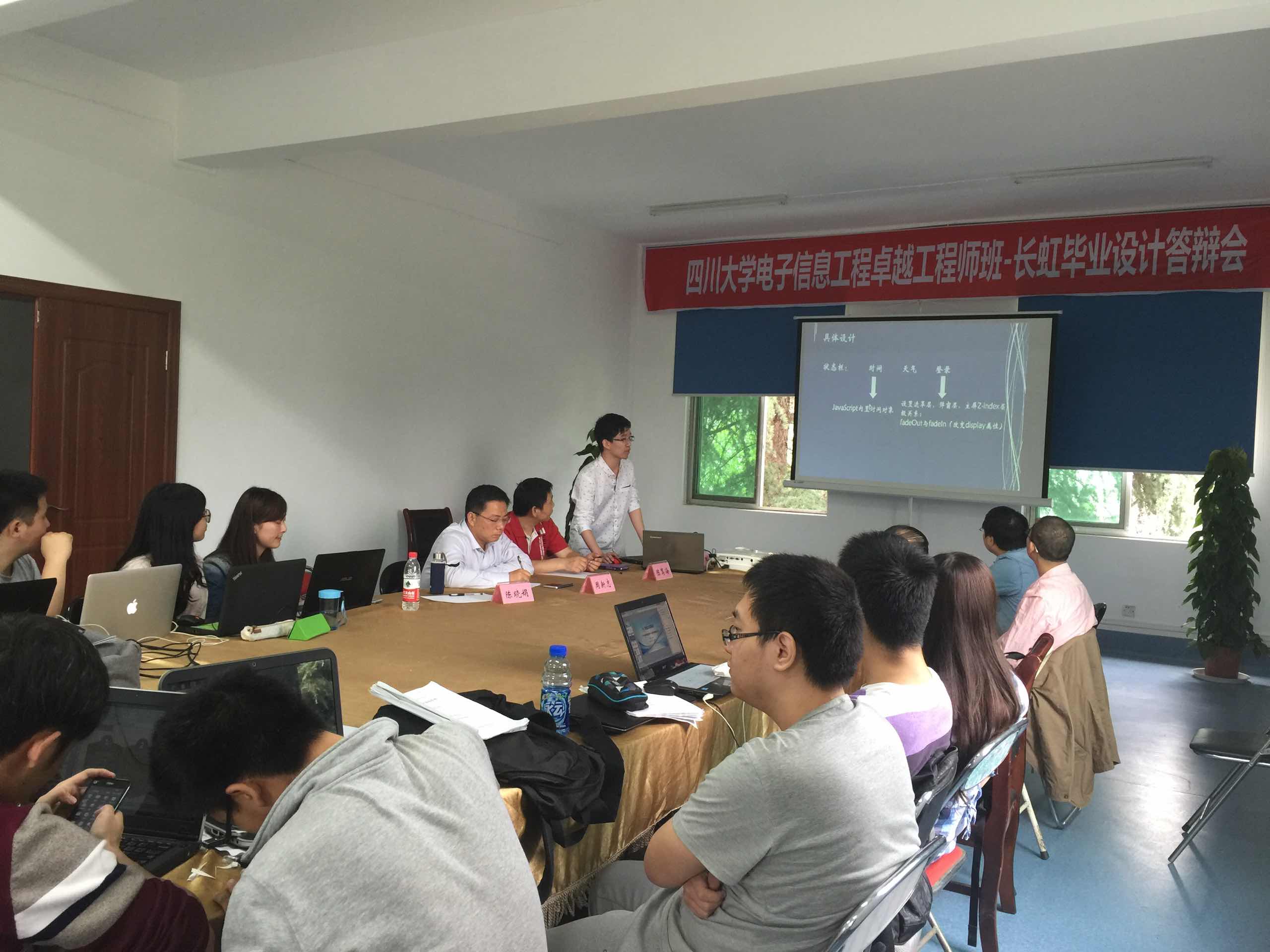2016年5月21日ok138cn太阳集团,太阳集团tyc9728,44118太阳成城集团卓越工程师班毕业论文(设计)答辩在绵阳长虹培训中心成功举行。参加本次答辩的老师有学院主管教学工作的副院长周新志教授、徐家品教授、党委陈笃海副书记、2012级本科辅导员陈晓娟老师、长虹培训中心的罗冬梅老师、蔡琳老师、李力老师,卓越班在长虹实习的14名学生全部参加了本次答辩。