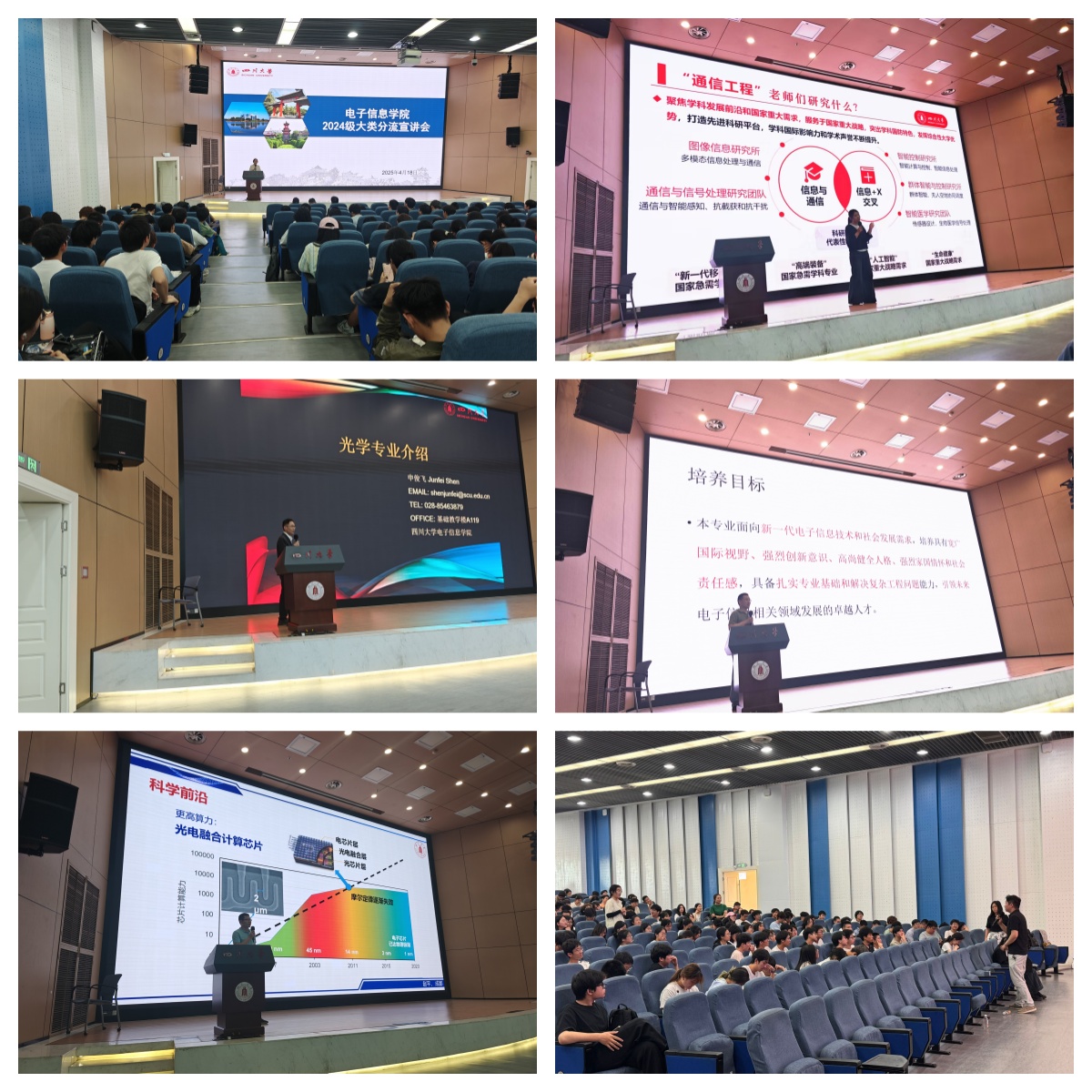 418日下午2:00,在江安校区水上报告厅开展了大类分流宣讲会,参加此次宣讲会的是学院骨干教师华伟、申俊飞、赵平、赵悟翔、孙亚平,学生辅导员陈晓娟,教学科老师以及学院2024级电子信息类所有本科生。