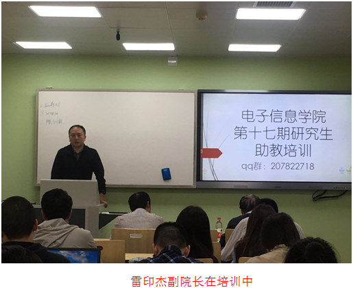 在教学方法与技能的培训环节,雷印杰副院长结合学院课程教学要求,对研究生助教承担教学辅助工作的具体要求如随堂听课、收集作业、辅导答疑、上习题课、组织课堂讨论、协助教师批阅作业等工作及学生对助教评教进行了讲解,并就助教加强和任课老师沟通、高效完成教辅工作等教学方法运用能力进行了培训。