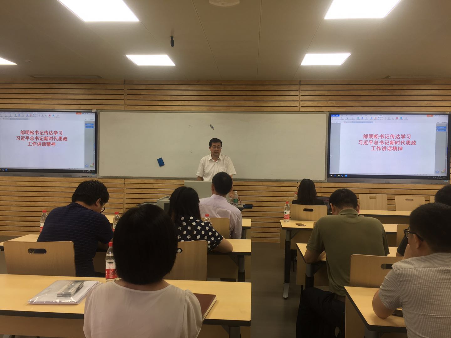 邰明松书记传达学习了习近平总书记新时代思政工作讲话主要精神,他强调,高校思想政治教育承担着培养中国特色社会主义合格建设者和可靠接班人的重大使命,最大限度发挥课堂教学的育人主渠道作用,是提升高校思想政治教育实效的关键抓手。思想政治理论课是落实立德树人根本任务的关键课程,思政课作用不可替代,思政课教师队伍责任重大。同时加快推进由“思政课程”走向“课程思政”的教育教学改革,实现全员全程全方位育人。一些高校的实践经验说明,探索在专业课程中加强大学生思想政治教育,比纯粹思政课更有说服力和感染力。