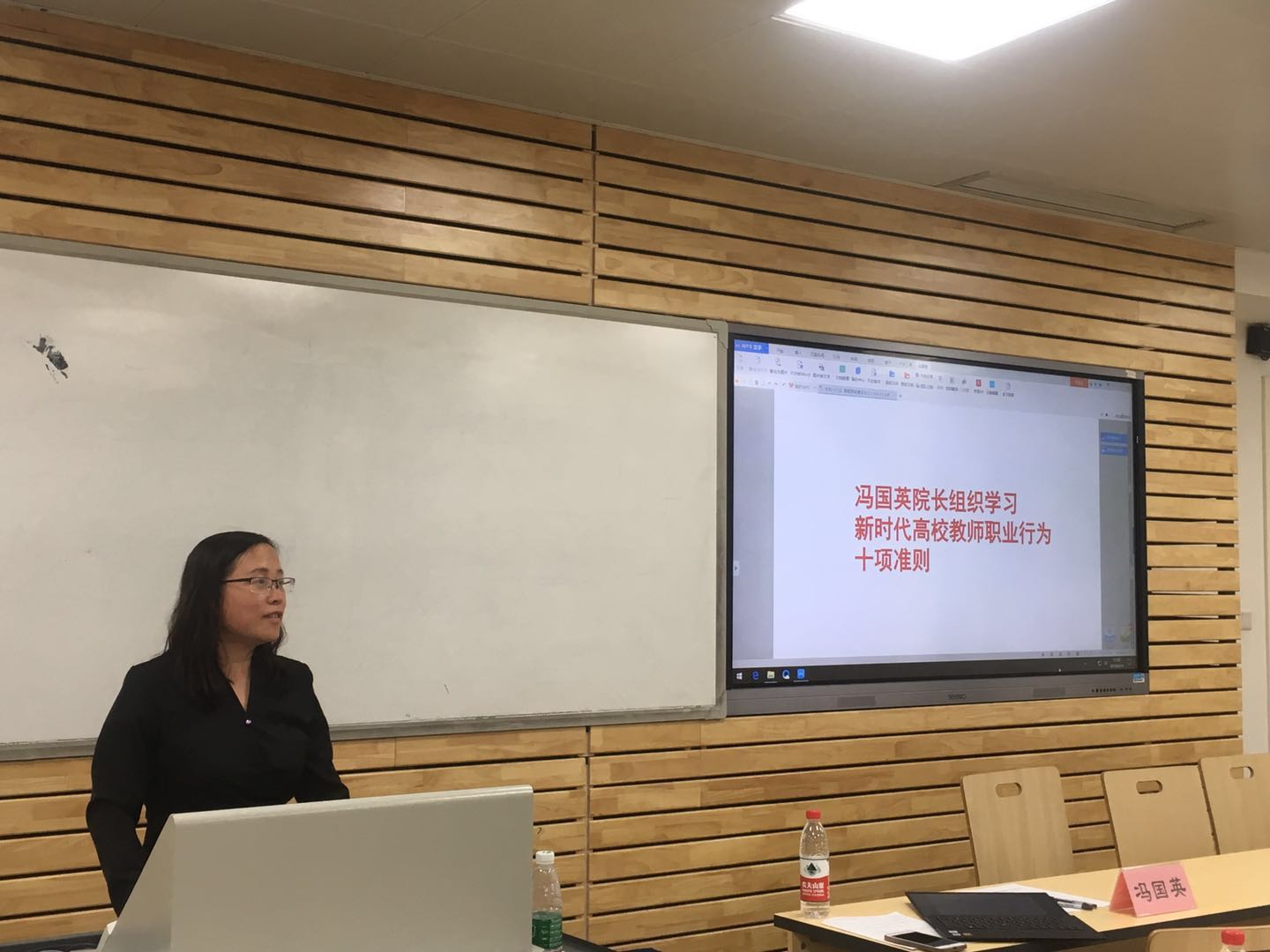 冯国英院长组织学习了2018年教育部印发的新时代高校教师职业行为十项准则,强调全院教师要结合学院及专业课程建设的实际情况,坚持用习近平新时代中国特色社会主义思想铸魂育人,认真贯彻党的教育方针,课堂上积极传播正能量,努力提升教书育人的质量,推进学院一流本科专业的建设。