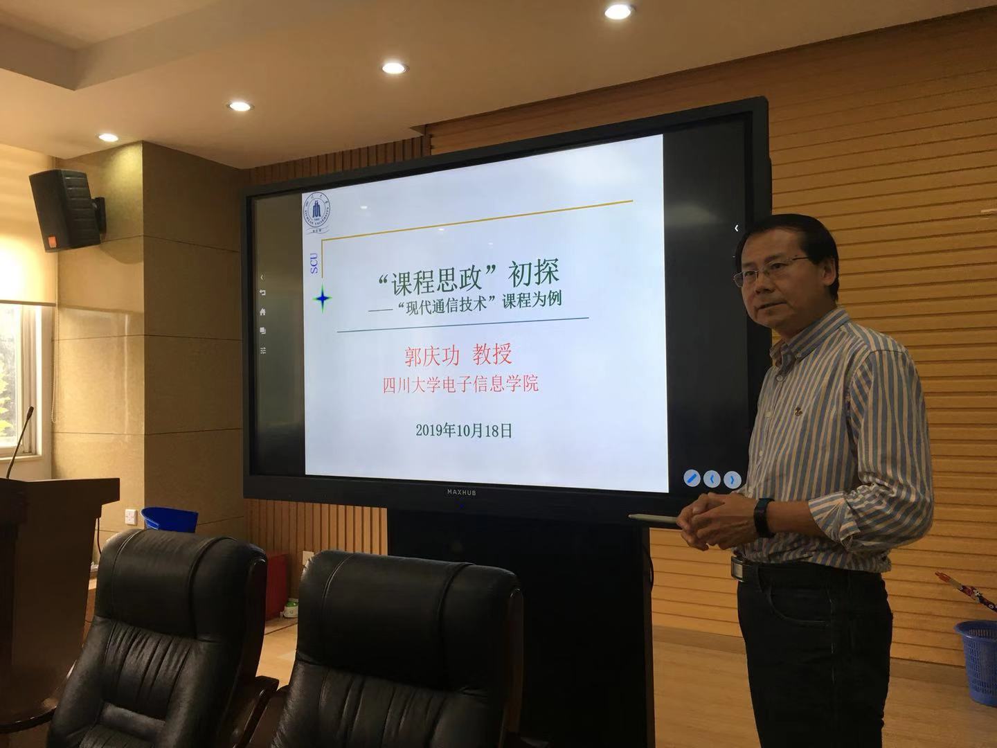 首先,学院2019年“课程思政”建设的榜样教师、通信教研室郭庆功教授以《现代通信技术》课程为例介绍了自己“课程思政”的实践与方法,他表示要注重发挥专业课程的育人作用,将素质养成教育潜移默化的融入教学之中,注重多样性、趣味性、寓德于教、寓道于教、隐性渗透;同时要重视老师自身为人师表、以身作则,言传身教的示范作用。