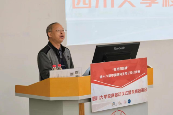 之后,中国电子学会研电赛组委会副秘书长刘霆轩老师对往届中国研究生电子设计竞赛的情况做了详细的介绍。重点对竞赛时间节点、作品提交要求、研电赛软硬件申请清单、往届决赛各技术方向晋级率、企业命题赛道、今年竞赛变化等方面做了详细讲解。随后太阳集团tyc9728廖勇明书记和副院长张启灿教授动员各位同学积极参与本次竞赛,鼓励同学们将所学知识运用起来,攻克企业面临的难题,为社会为国家做出自己的贡献。