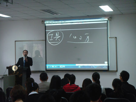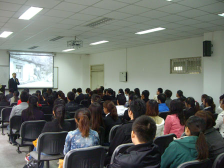 主讲人用做好的DV短片,向同学们介绍了爱国者的品牌以及相应的创新成果,并指出了该公司与华为的不同之处:华为注重的是市场,而爱国者注重的是创新。而后结合自己从贫穷到富裕,从失败到成功的经历,告诫大家:人生在于追求、有追求才有价值,成功是属于有准备的人的。期间,周先生幽默、风趣的语言,使会场气氛相当活跃。