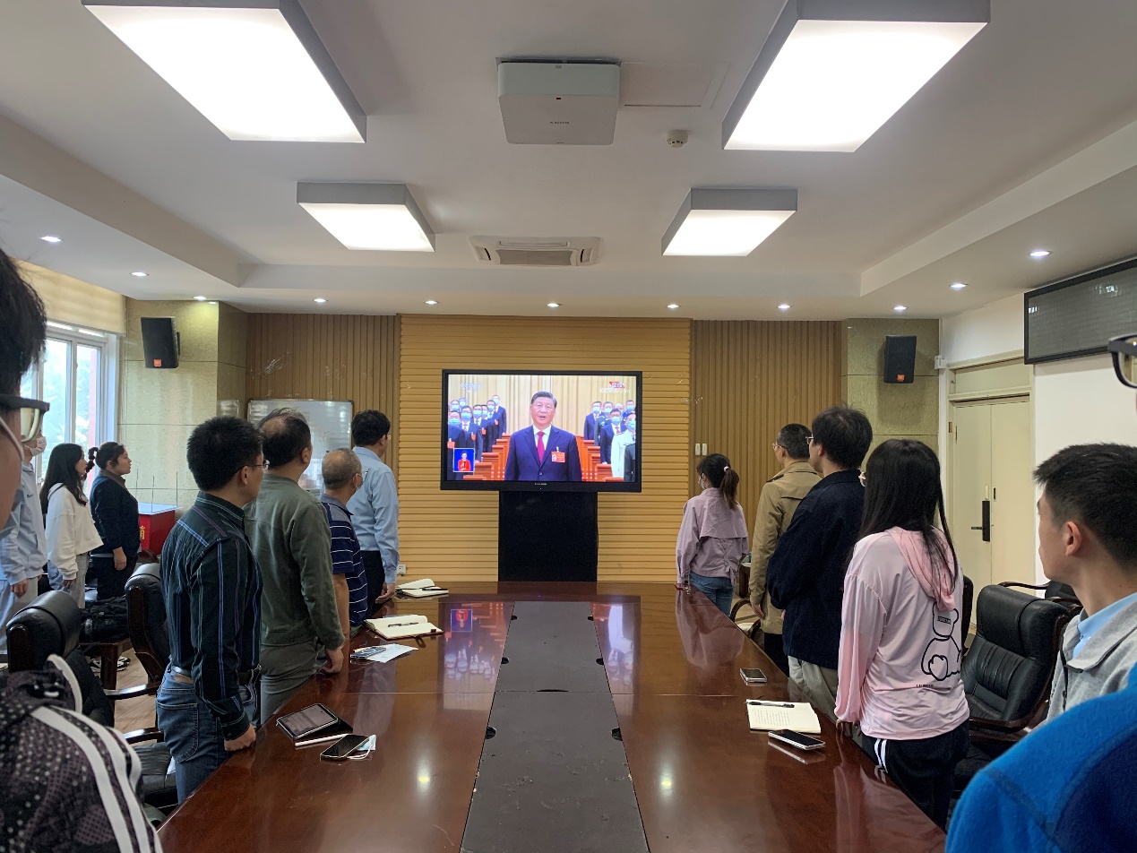 十点会议准时开幕,全体师生随着直播在会场起立,神情庄严肃穆,奏唱国歌,并怀着十分崇敬的心情,为毛泽东、周恩来、刘少奇、朱德、邓小平、陈云等已故老一辈无产阶级革命家和革命先烈默哀。随后,全体师生聆听了习近平总书记代表十九届中央委员会作的报告,本次大会的主题是高举中国特色社会主义伟大旗帜,全面贯彻新时代中国特色社会主义思想,弘扬伟大建党精神,自信自强、守正创新,踔厉奋发、勇毅前行,为全面建设社会主义现代化国家、全面推进中华民族伟大复兴而团结奋斗,报告分为十五个方面。