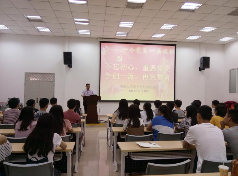 活动由李运国老师主持,院党委副书记陈笃海教授做了主题讲话。陈书记回顾党史,介绍了党在新形势下的取得的当代可喜成绩,并结合ok138cn太阳集团近期召开的第八次党代会,向全体与会党员提出殷切期望,希望学生党员同志牢记使命,不忘初心,坚持共产党领导,全心全意为人民服务!为全面推进学校党的建设新的伟大工程和建设世界一流大学新的伟大事业贡献力量,以优异的成绩迎接党的十九大顺利召开!接着,陈书记带领全体党员面向党旗,庄严宣誓,不忘初心,牢记使命!