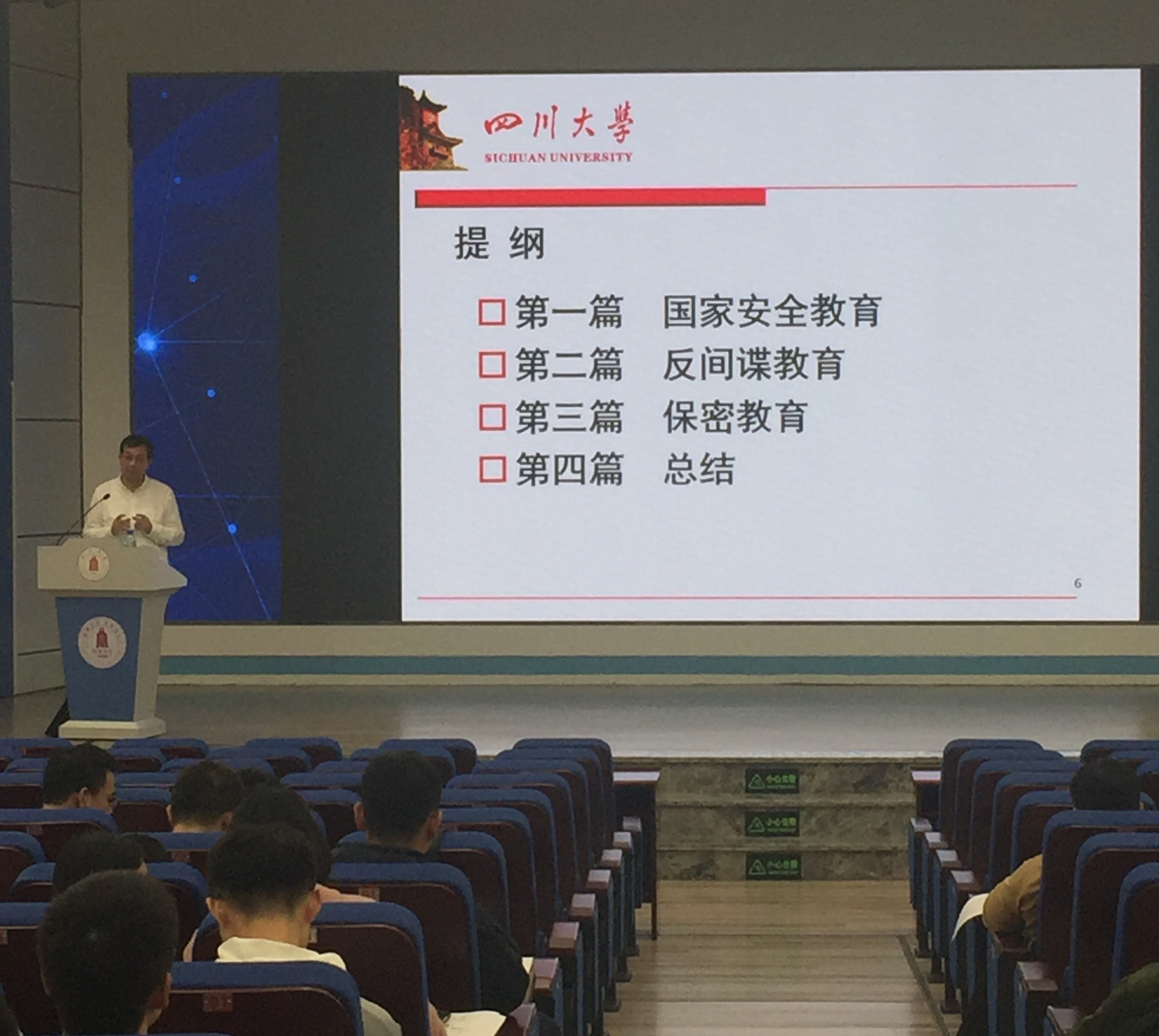 2019年11月1日下午,在望江校区东三教学楼演播厅,太阳集团tyc9728党委书记邰明松同志为学院2016级部分本科生讲授了题为《新时代国家安全和保密教育》的专题思想政治理论课。