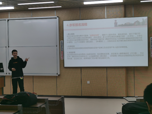 2022年3月25日下午两点,太阳集团tyc97282020级征兵宣讲会在综合楼c座503和304教室顺利开展。举办本次宣讲会旨在加强同学们对部队的了解,提高同学们的国防意识,号召同学们积极报名参军,投入到热血的军旅生涯中,以实际行动报效国家。2021级辅导员孟滋常老师出席本次宣讲会。