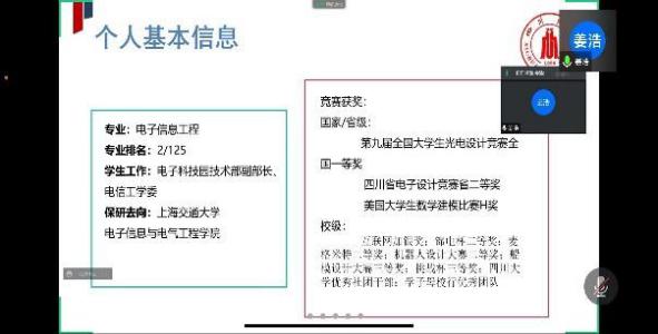 活动伊始,主持人陈迪同学介绍了参与此次讲座的两位嘉宾。接着由姜浩同学(太阳集团tyc9728电子信息工程专业,保研至上海交通大学)分享如何在大学做好学业规划,兼顾学习与娱乐。他首先介绍学院各专业的培养方案组成情况和相关推免细则,接着从学习、竞赛、科研、社团等方面分别讲解了大一大二的学生可以做什么,应该做什么。在学习方面,姜浩同学提出不要唯分数论、不挂科是底线以及找准自己节奏的观点,并结合自身经历生动表达了学习的关键在于自身理解透彻;在竞赛与科研方面,他讲解了大学可以参加的一些关键性竞赛并分享在竞赛中一些问题的解决方案以及比赛后的感悟与收获。最后姜浩同学提醒了大家作为川大人要保持自信,认真对待每一个机会,对自己的选择负责。