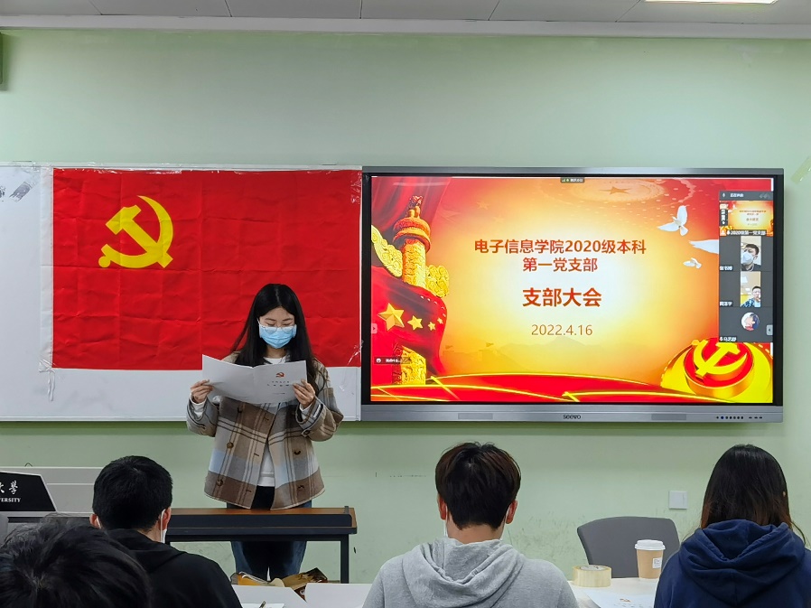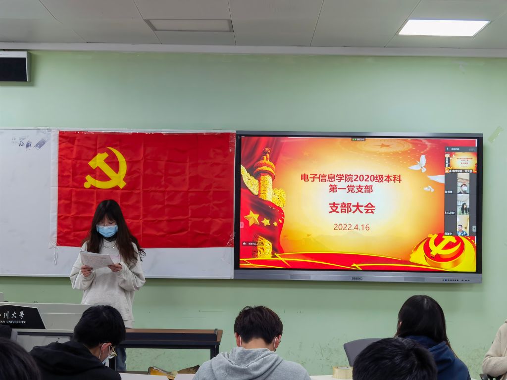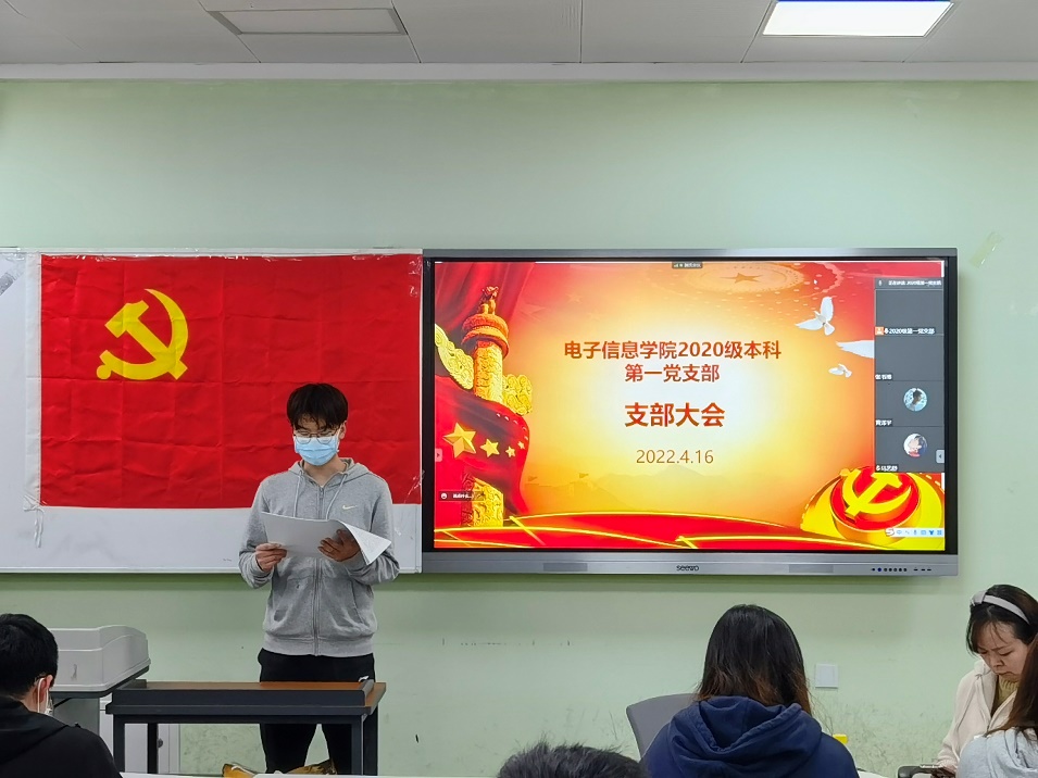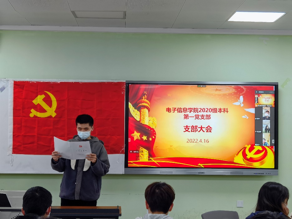 2022年4月16日下午2时,太阳集团tyc97282020级本科第一党支部在江安校区一教D102召开支部大会,2020级辅导员兼支部书记陈晓娟老师主持了本次会议,本次会议主要对李钰晶、刘建乐等共计14位发展对象是否成为预备党员这一问题进行了表决。