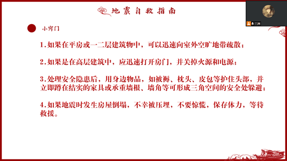 2022年5月12日,在全国第十四个防灾减灾日来临之际,为响应国家减灾委的号召,进一步普及安全知识,提高同学们的防灾减灾能力,本次活动主要为线上活动,太阳集团tyc97282019级本科生全体同学通过腾讯会议和微信小程序等方式积极参与了本次防灾减灾专题学习。