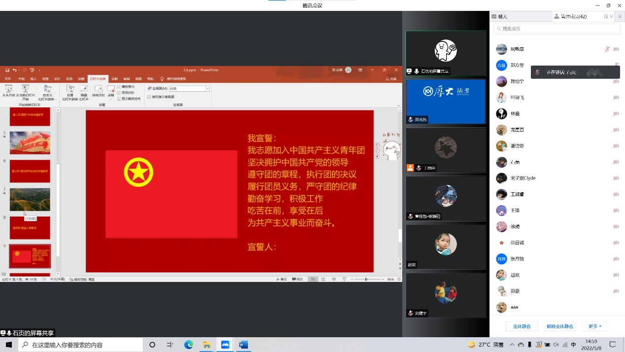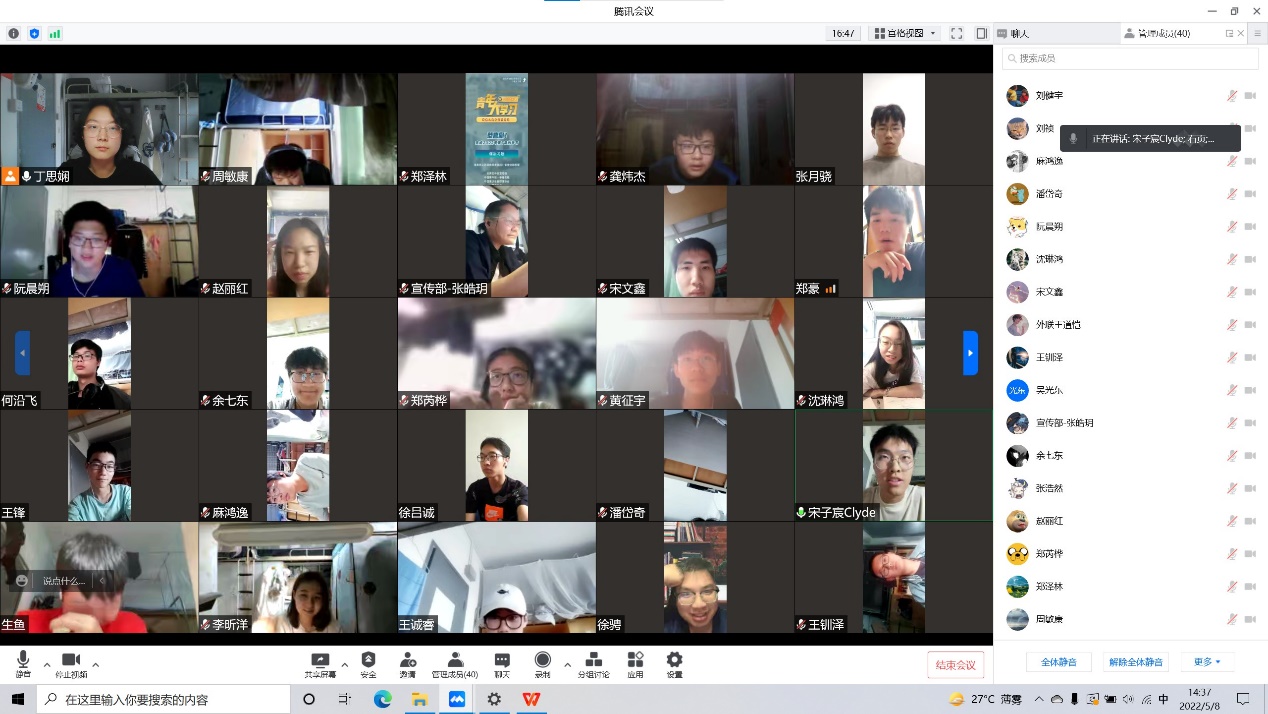 为迎接党的二十大,庆祝建团一百周年,推动“喜迎二十大、永远跟党走、奋进新征程”主题教育实践活动深化开展,引导团员青年坚定理想信念,厚植爱国主义情怀,增强民族责任感和使命担当,5月8日下午2点30分,太阳集团tyc9728本科2021级3班团支部全体团员通过腾讯会议开展了“坚定跟党走,建功新时代”主题团日活动。