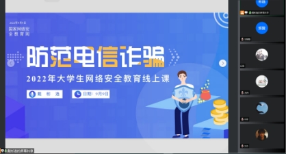 2022年9月9日,受疫情影响由电子科技园举办的以保护个人隐私安全,树立网络安全意识为核心的网络安全宣传教育活动以线上会议的形式开展并通过腾讯会议顺利举行。2022级大一新生参加了本次活动。