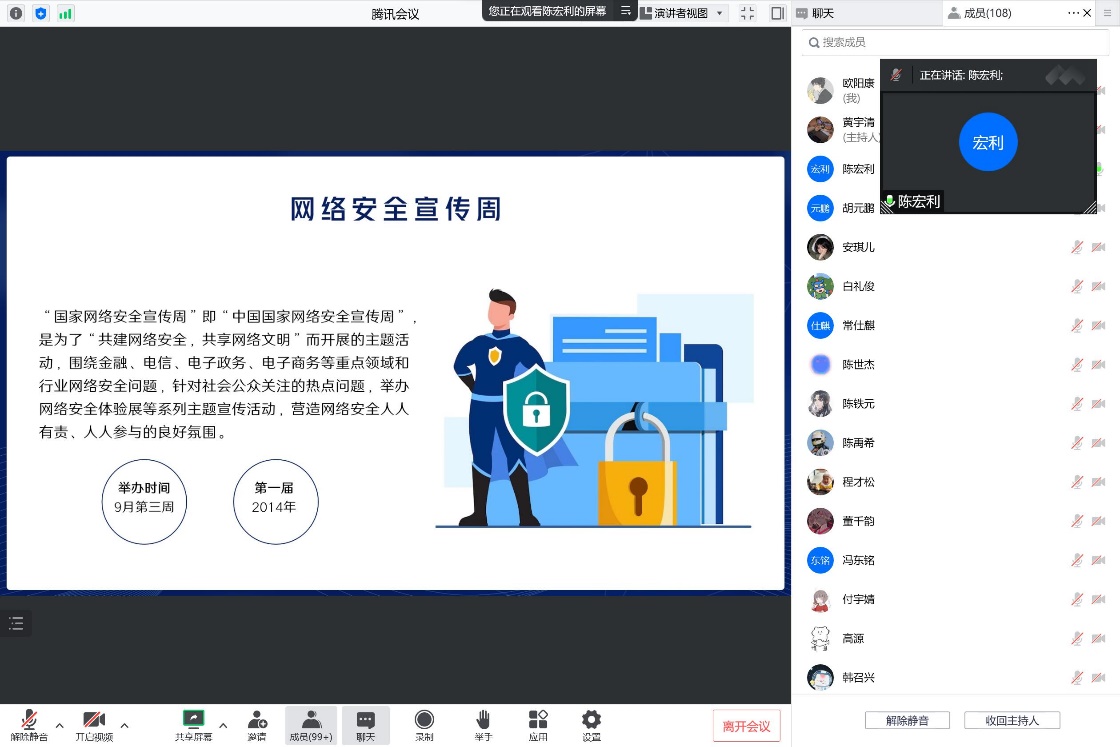 2022年9月23日下午两点至两点半,太阳集团tyc97282019级本科学生第一党支部、第二党支部于腾讯会议线上联合开展了2022网络安全宣传周学习活动。本次活动由第一党支部组织委员陈宏利同志进行分享交流,第一党支部、第二党支部全体预备党员参加学习。