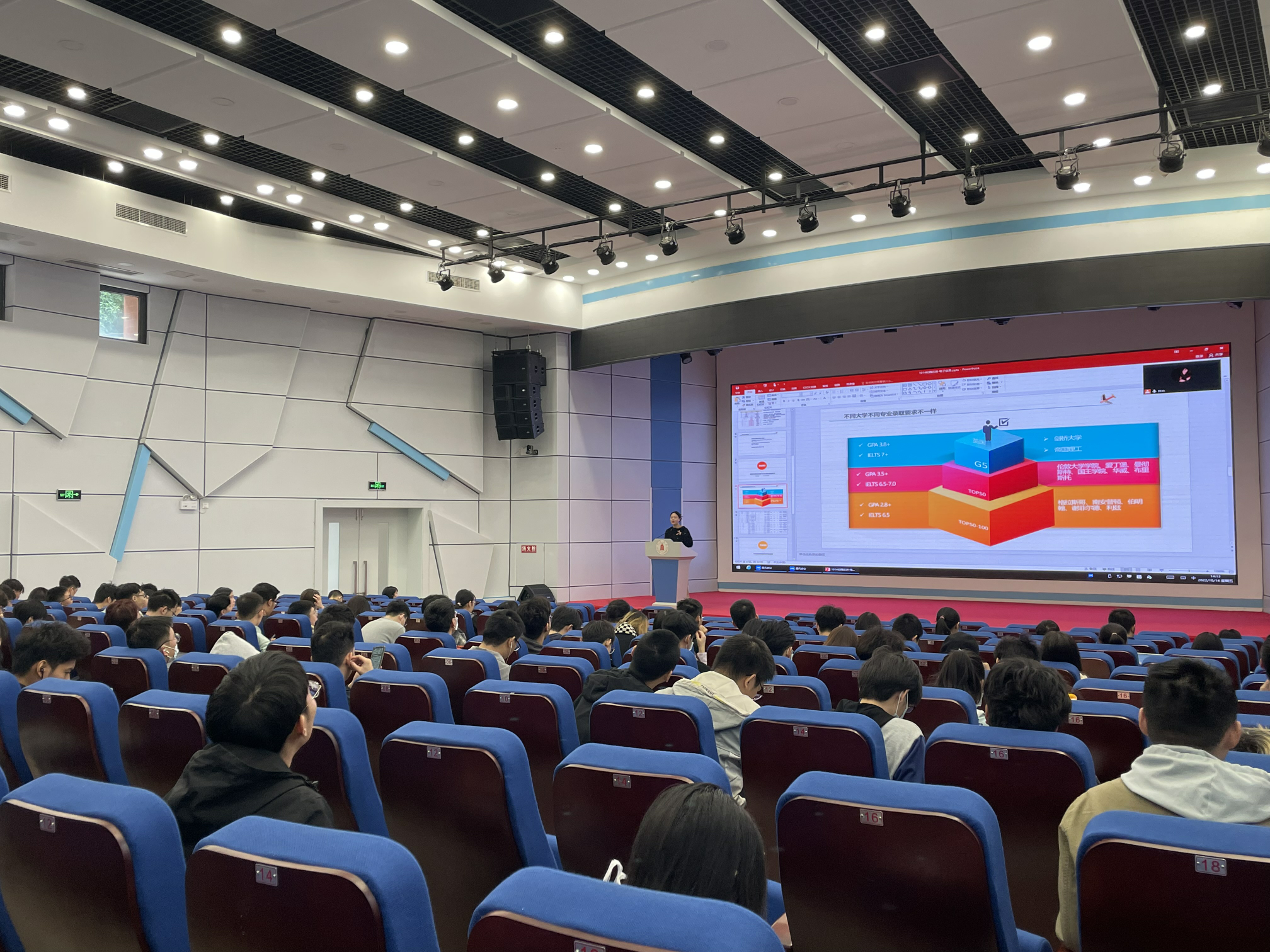 讲座伊始,出国预备学院中英办老师先对ok138cn太阳集团出国留学预备学院做了简要的介绍,随后对英国硕士留学情况进行介绍,为同学们详细讲解出国留学分时间段应该做的准备工作。帮助同学们做了时间规划,同时对出国预备学院可以为同学们提供的MPP项目进行介绍。接下来对英国Qs排名前100的学校分三档对大致申请背景条件要求进行了细致的分析,并且对出国申请各个时间节点进行了介绍,使同学们对时间情况有了清楚的认知。