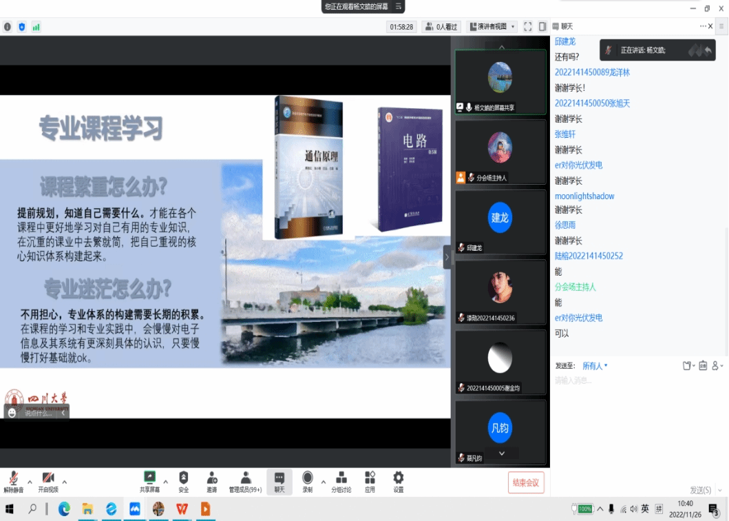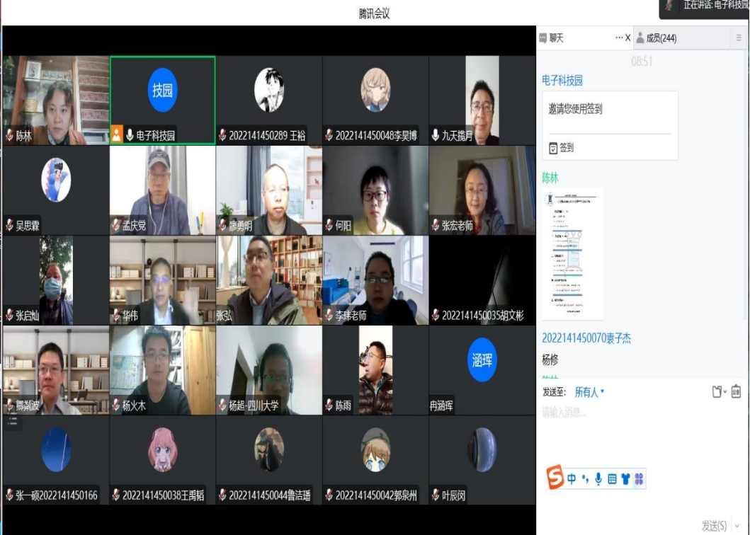 2022年11月26日上午9点,电子科技园2022会员大会暨学术交流会议程在腾讯会议顺利进行。出席议程的有太阳集团tyc9728党委副书记廖勇明老师 、副院长张启灿教授、副院长卿粼波教授、华伟副教授、张宏副教授、陈雨副教授、李玮副教授、杨火木副教授、张弘副教授、孟庆党老师、李小舜老师、孟滋常老师、陈晓娟老师、何阳老师、朱婧老师、陈林老师、科技园优秀学长学姐廖佳佳、吴宇峰、邱建龙、杨文皓,以及科技园主席团,各部部长和全体太阳集团tyc9728同学。