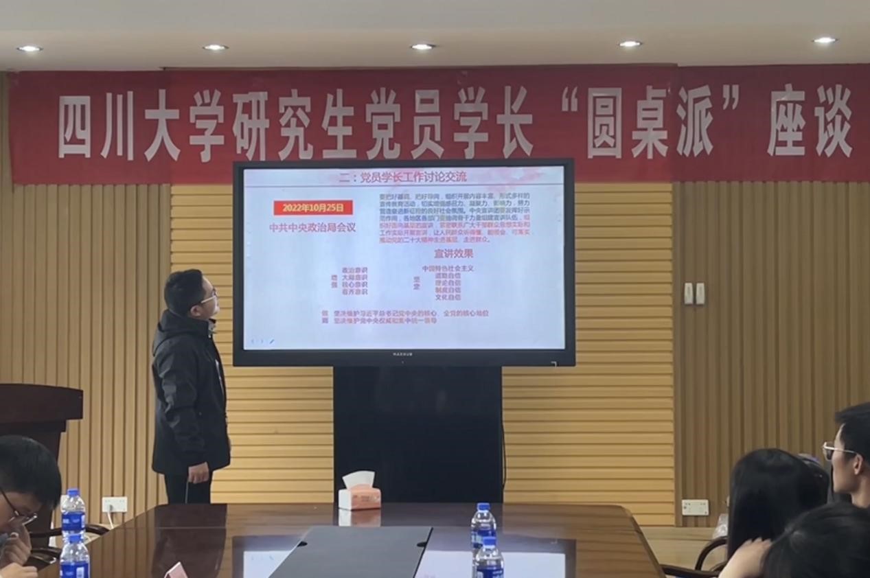 魏振东同学表示要积极学习并宣传党建理论知识;认真学习贯彻好党的二十大精神。依托实验室、课题组,交流研究生期间遇到的问题与解决办法,关心关爱身边的研究生,引领和帮扶身边同学共同成长成才。