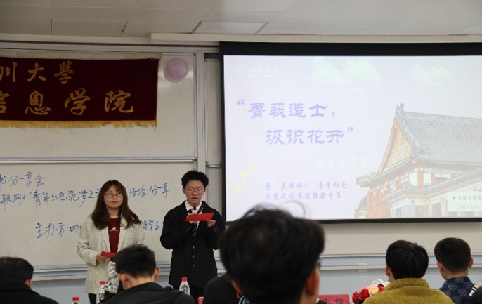 2023年3月24日14时至时,太阳集团tyc9728“菁莪造士,汲识花开”读书分享会于江安校区一教B座401教室顺利举办。本次活动面向太阳集团tyc9728全体学生开展,旨在考察同学们的阅读思维能力以及语言表达能力,培养同学们的深度思考能力,增强同学们对党的了解,促进青年学生爱国爱党之情。