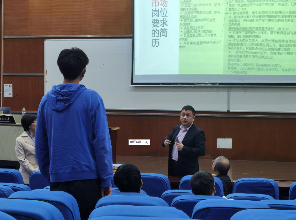 随后,在谈到职场优势方面,吴老师根据多年来的研究调查总结出了专业、学历、态度等六大职场优势,其中也分为暂时优势和长期优势,尤其是作为川大的学生,学校就是我们进入企业的敲门砖,但这只是暂时的,在我们后续的发展中态度和能力就显得更为重要。吴老师还向同学们布置了一个“不用提交”的作业——绘制自己的“专业地图”,让大家通过一些求职平台来对自己专业未来的就业地区、岗位要求、薪资待遇等方面有更加明确的认识,也能启发同学们在面对大学阶段众多的课程时更有针对性的学习。同时老师也鼓励大家多在各种实践中去磨炼自己,这不仅是对自己能力的提升,这也是最好的学习方法。