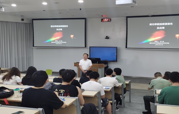 本次招生宣讲会由国防科技大学前沿交叉学科学院的多位老师和同学亲临现场,其中国防科大的侯静研究员在现场与同学们分享了她所负责的科研项目,丰富了同学们对于光研究的方向。而王小林研究员则是介绍了本科和研究生的招生计划,在未来的科学研究上给予了同学们莫大的鼓励。