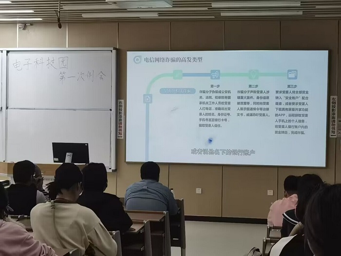 院党委副书记兼纪委书记廖勇明,大一年级辅导员申鑫,学院分团委副书记、大一年级辅导员陈林,电子科技园全体干部、全体干事参加了本次会议。本次网络安全教育活动,科技园全体干部与干事们通过观看一堂网络安全教育课的视频系统地学习了相关知识。课程先是阐述了网络诈骗的损失大、范围广、危害重的特性,随后通过讲述诈骗的具体手段列举了网络诈骗的高发类型,如刷单返利类诈骗、冒充公检法诈骗、冒充客服类诈骗、虚假投资理财诈骗、虚假网络贷款诈骗等。面对千变万化,无孔不入的电信网络诈骗,遵循“三不一多”原则,下载国家反诈APP则是我们有效的防范手段。从总体上学习完电信网络诈骗后,课程又以网络的原住民——我们大学生的视角,从实例出发讲述了电信网络诈骗的类型,如虚假购物诈骗、虚假征信诈骗、冒充熟人的诈骗等,并阐述了大学生遭遇电信网络诈骗的种种原因。