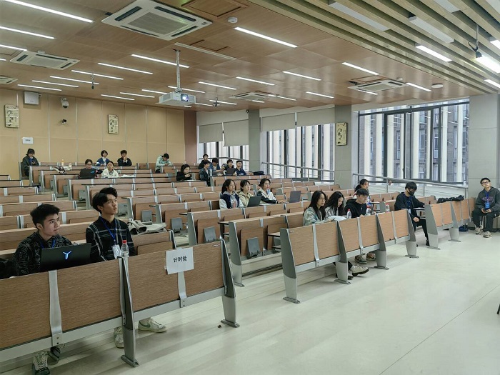 图一:评委和同学们听取参赛人员的报告