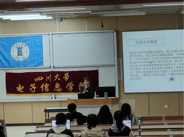 在大赛现场,各小组依照发布的比赛时间,提前十分钟到场等候,之后依次派出代表上台向评委介绍本小组的概念产品。每个小组都精心准备了PPT,在规定的4分钟展示时间内,从灵感、需求、产品概念图、可行性分析、产品成本和技术难关等方面向听众详细介绍了自己小组的产品,并由评委进行审评。最后,在下午1点30分,所有小组展示完毕,初赛圆满结束。