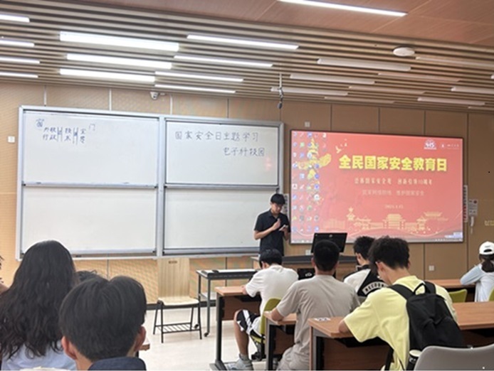 (图为电子科技园申骏宇学长向同学们强调国家安全的重要性)