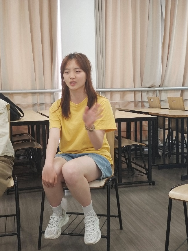 最后一项活动,何惠老师指定一位同学作为“演员”,在连续三分钟的时间内不停说话,内容不限;其余人在倾听的过程中要观察“演员”的动作神态,感受自己的想法以及情绪。三分钟过后,大家从不同的角度观察到了很多不一样的东西,虽然“演员”说的话与大家并无联系,但每个人都意外地收获了很多感悟,也进一步理解了自己的内心。