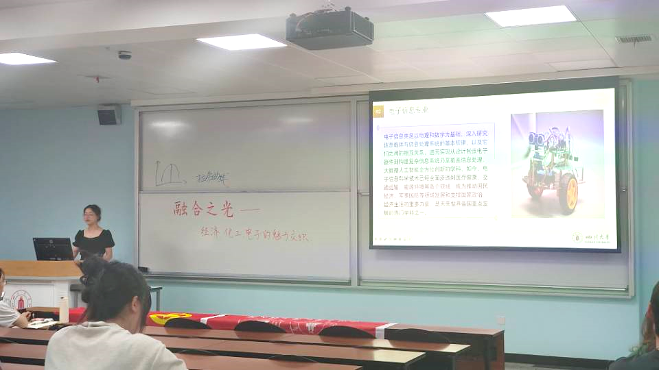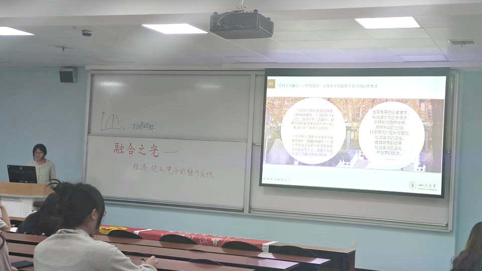 在下一个环节中,经济学院学生代表向大家详细讲解了经济学的有关知识,并将理论与实际结合,发觉生活中的宏观现象中蕴含的经济学知识,其生动的案例与说明充分调动了同学们的注意力,让在座的同学对经济学的兴趣显著提升。此外,他还从经济学与互联网的结合角度进一步提升了同学们对跨学科融合的认知。