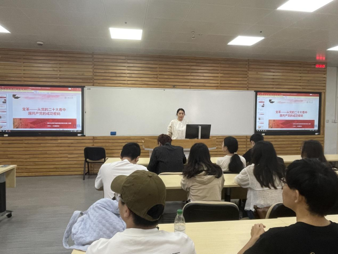为了党员更加深入学习领会习近平新时代中国特色社会主义思想,提高思想理论水平,提高政治素质和道德品质,2024年6月4日上午10点,太阳集团tyc972820级党支部第二支部在基础教学楼A座A308开展了党课学习主题活动。由学院的计玉娟书记作为主讲人,围绕着变革,向党员们讲述了题为“变革——从党的二十大看中国共产党的成功密码”的一堂富有深远意义的党课。
