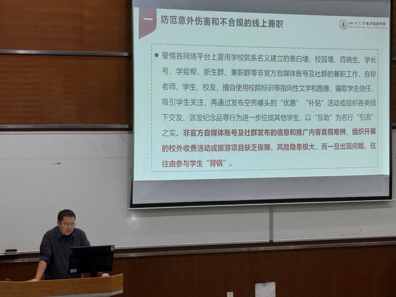 会议伊始,申鑫老师首先强调了防范不合规兼职的重要性。他指出,近期有同学受到网络“高薪兼职”诱惑,参与了不符合规定的线上兼职活动。申老师详细讲解了常见的兼职骗局,包括要求缴纳中介费、押金或其他变相费用的黑中介,以及以“好评刷单”“点赞刷评论”等为名的诈骗活动。他提醒同学们,所有刷单行为都是违法的,切勿轻信高额回报的承诺,并要警惕夜间或偏远地点的兼职,以免人身安全受到威胁。