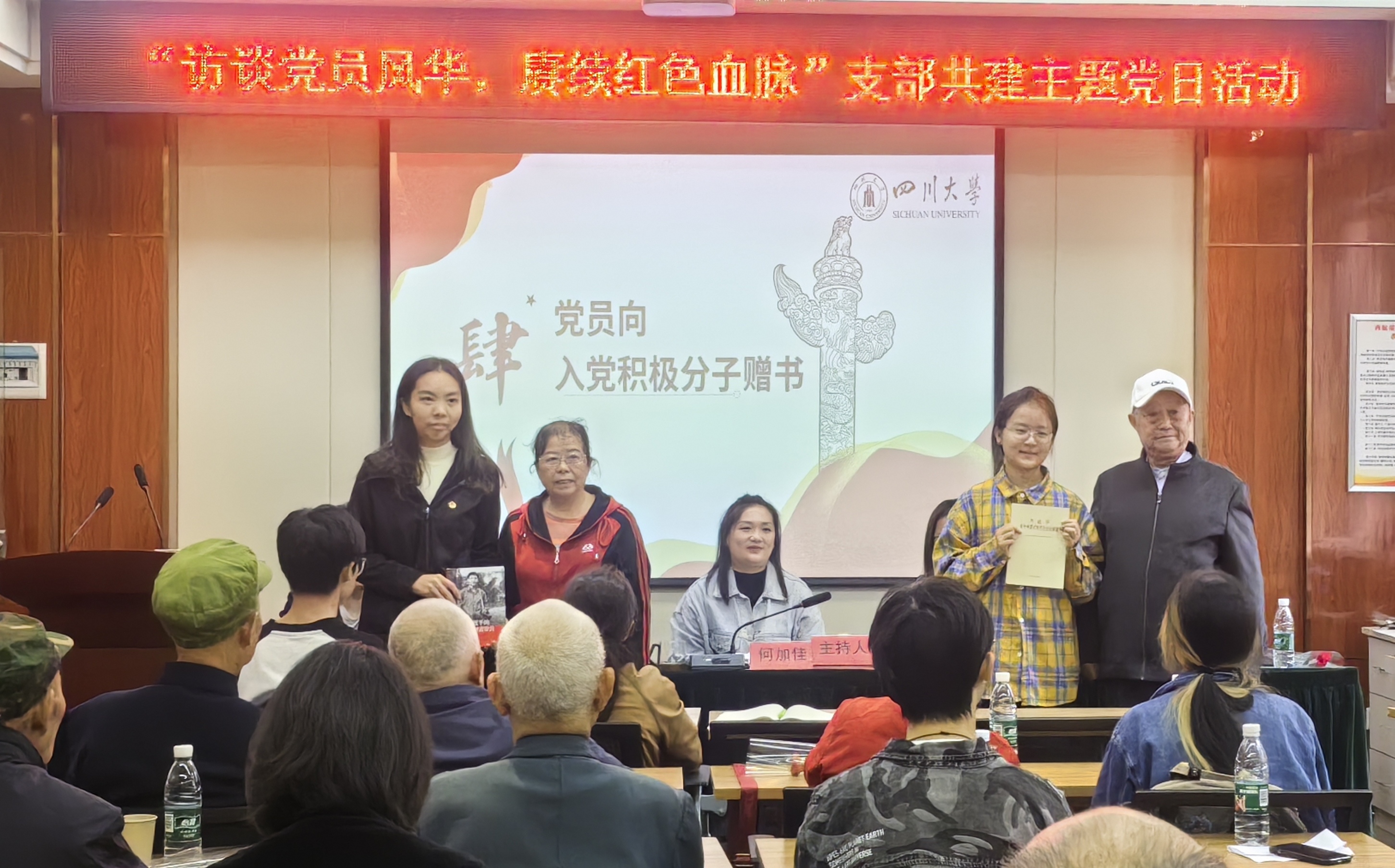 活动接近尾声,为表达对党员的感激之情,学生代表朱远诚、庞丙仡、刘宇涵向党员献花。白家场社区党总支部老党员代表向入党积极分子代表赠书。