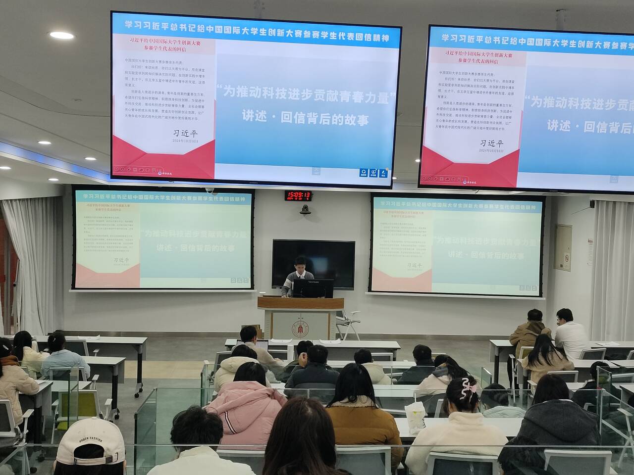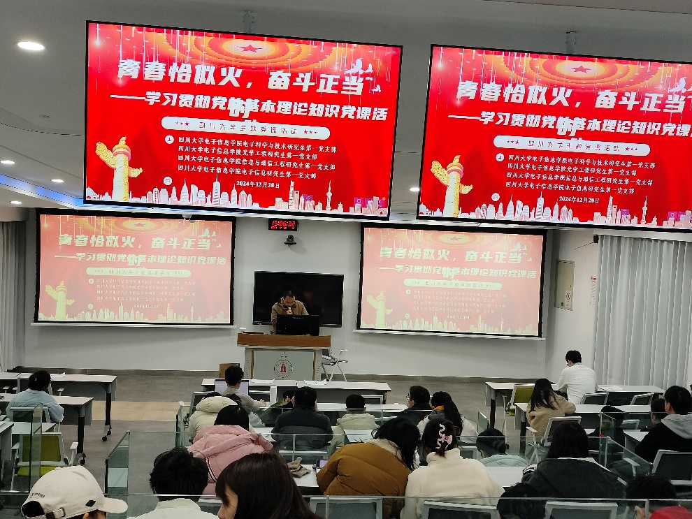 青年兴则国家兴,青年强则国家强。为深入学习贯彻习近平新时代中国特色社会主义思想,同时激发青年党员的创新精神和奋斗热情,2024年12月20日15:00,ok138cn太阳集团,太阳集团tyc9728,44118太阳成城集团电子科学与技术研究生第一党支部、光学工程研究生第一党支部、信息与通信工程研究生第一党支部和电子信息研究生第一党支部在望江校区基础教学楼C座103联合举办了一场主题为“青春恰似火,奋斗正当时”——学习贯彻党的基本理论知识党课活动。本次党支部学习大会由于鲲鹏同志主持,各支部全体党员和积极分子参会。
