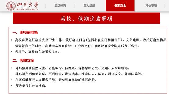 最后,陈林老师强调,同学们在离校前要做好寝室安全卫生工作,锁好寝室门窗(包括小寝室门和阳台门),关闭电源,收拾好寝室物品,保管好自己的财物,贵重物品可到宿管中心办理寄存,确认没有安全隐患后方可离开。陈林老师还提醒同学们离校前在微服务进行报备。