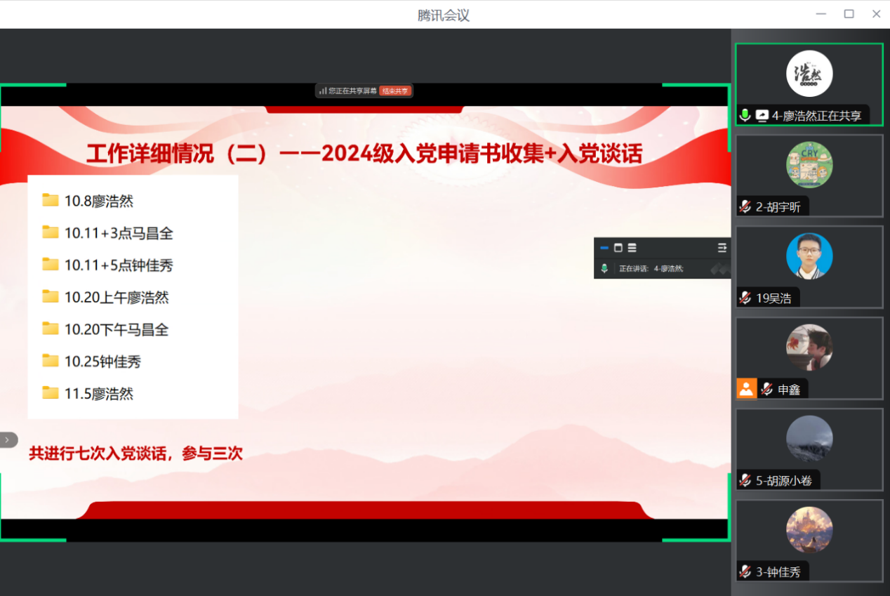 在述职过程中,党支部助理廖浩然特别提到,他将在下学期组织“红途轮忆、青讲党史”活动,通过生动有趣的形式带领同学们深入学习党史,传承红色基因。此外,7班团支书莫斌斌在上学期的表现尤为突出,他充分利用校青马工程学员和电子之鹰宣讲团成员的身份,组织了理论扎实、形式丰富的团日活动,不仅提升了同学们的思想政治素养,还增强了班级凝聚力。他的创新做法为其他班级提供了宝贵的经验借鉴。