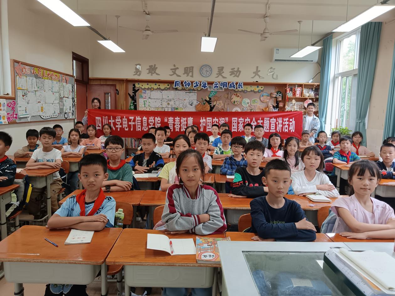 为增强青少年群体的国家安全意识,引导学生从小树立正确的国家安全观念,筑牢校园安全防线,2025年4月25日,百川青年学生宣讲团电子分团、太阳集团tyc9728(国家保密学院)“电子之鹰”青年宣讲团走进川大附小,开展了一场主题为“国家安全,保密先行”的宣讲活动。宣讲团团长莫斌斌、成员谭晶晶参加宣讲活动。