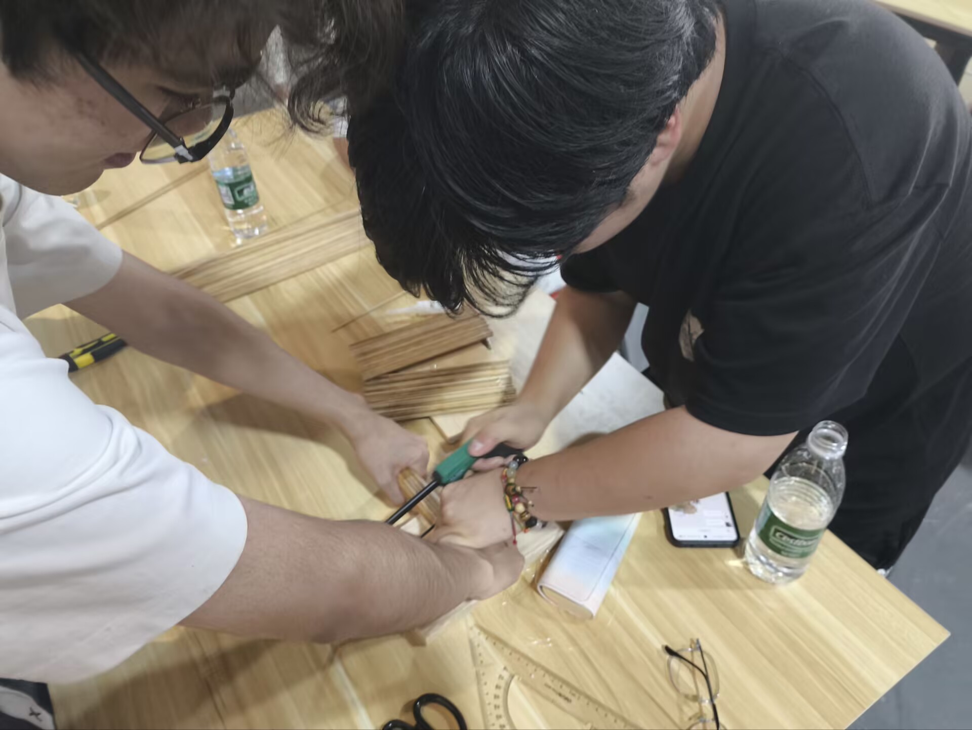 在木工实践环节,同学们以3-4人为一组,展开了紧密的分组协作。大家积极投入到制作过程中,从木材的测量、切割,到精细的打磨、组装,每一个步骤都充满了挑战,也凝聚着大家的专注与努力。在这个过程中,同学们遇到了诸如尺寸偏差、拼接不牢固等问题,但在木工师傅的耐心指导下,大家不气馁、不放弃,不断尝试和改进。经过约50分钟的努力,一个个独具匠心的小物件终于在同学们的手中诞生,这是他们汗水与智慧的结晶。