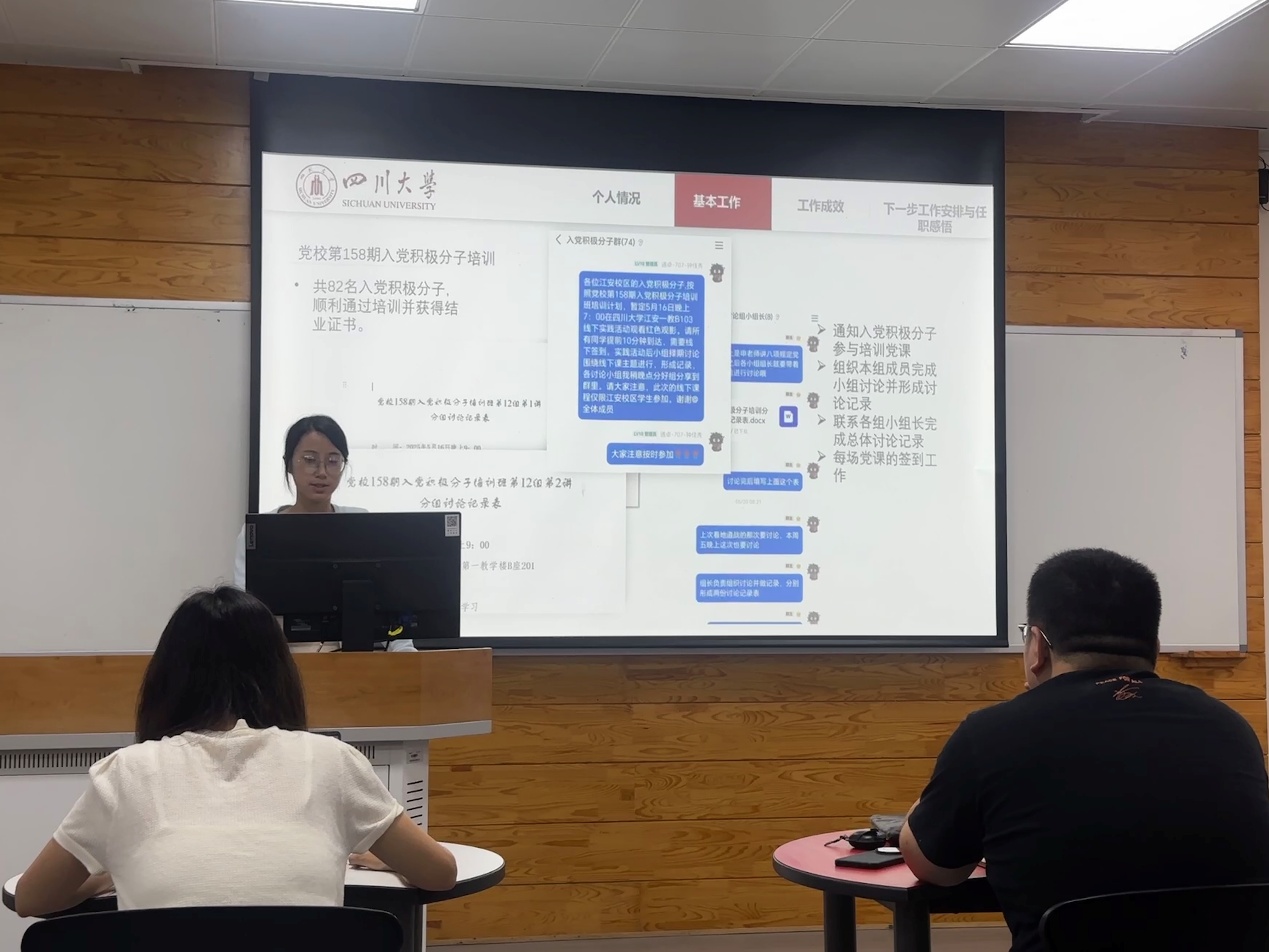 在述职过程中,党支部助理钟佳秀在述职中详细介绍了本学年的党建工作成果。她组织开展了“红途轮忆,青讲党史”主题活动,有效提升了同学们的政治素养。