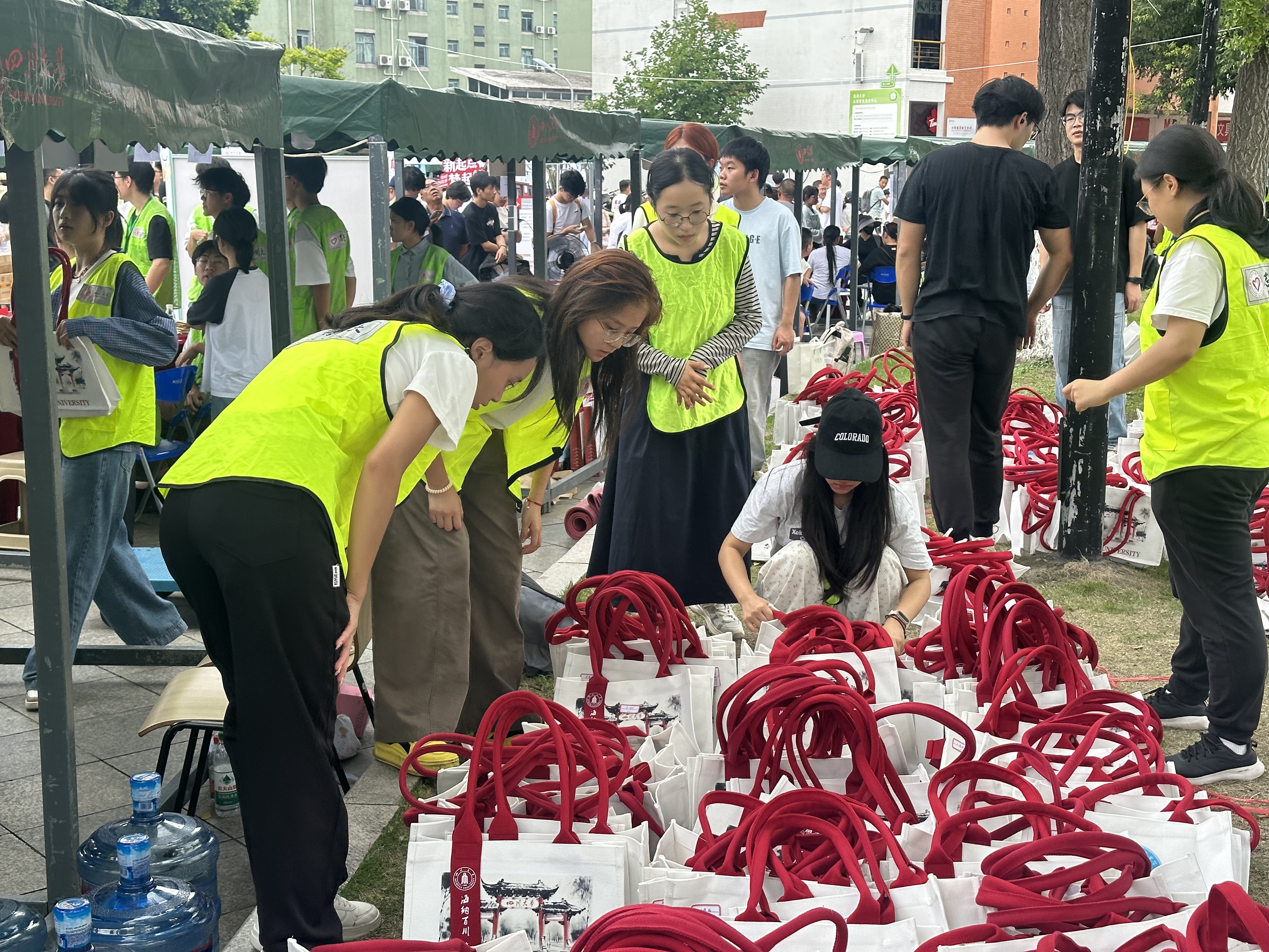 图为志愿者正在清点迎新物资