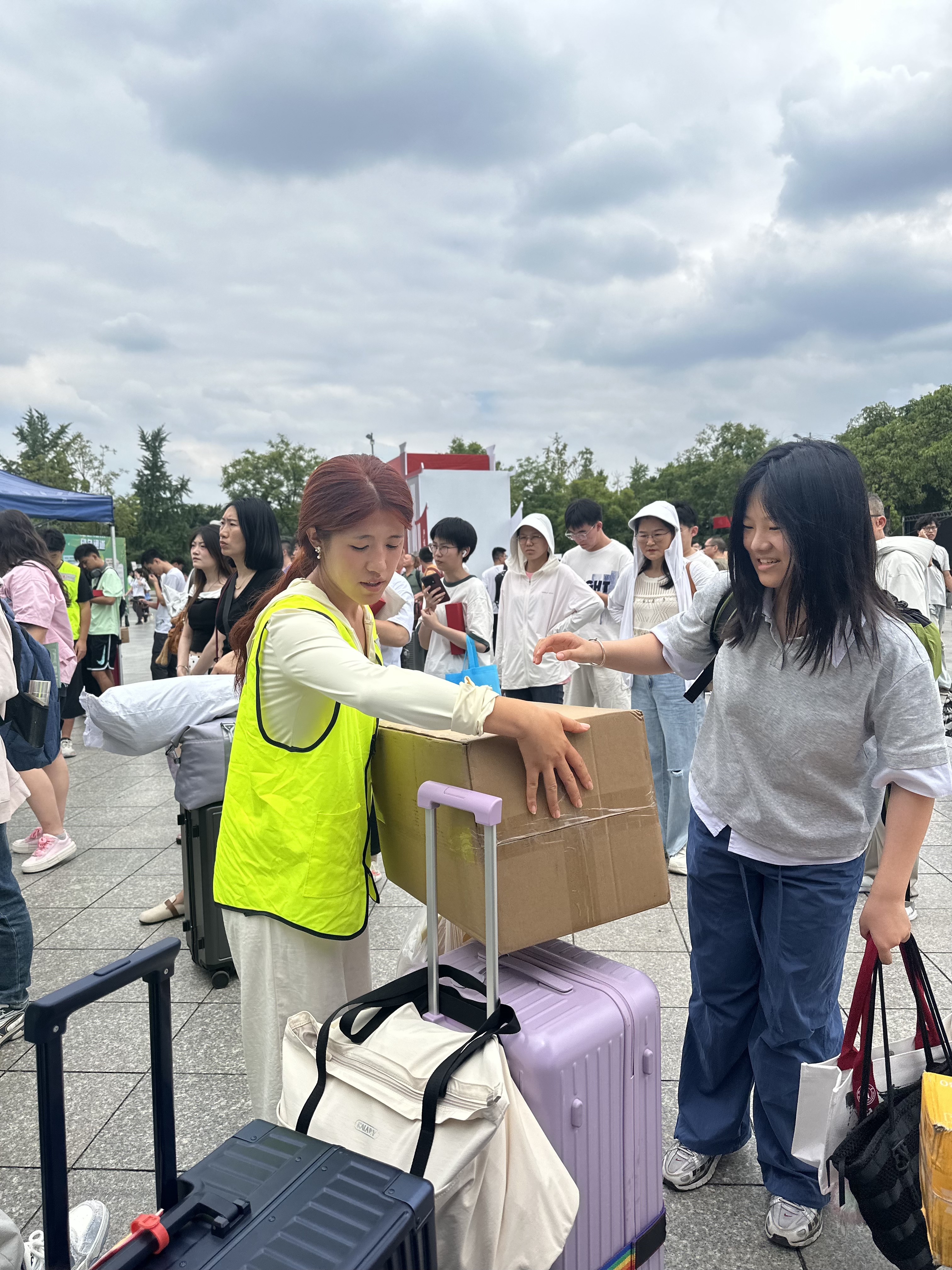 图为志愿者正在帮忙搬运行李