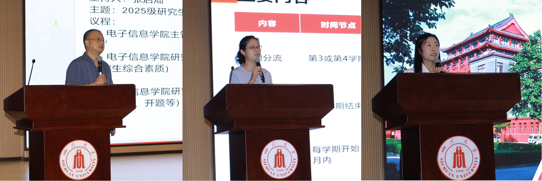 导师代表何小海教授介绍学院学科优势,给新生提出四点建议:志存高远且脚踏实地;保持好奇又专注方向;勇于试错并学会协作;扎根技术且心怀社会,同时,何教授表示学院教师是我们学生的坚强后盾,会全力为大家提供实验资源、学术平台与交流指导,助力新生在科研道路上稳步前行。