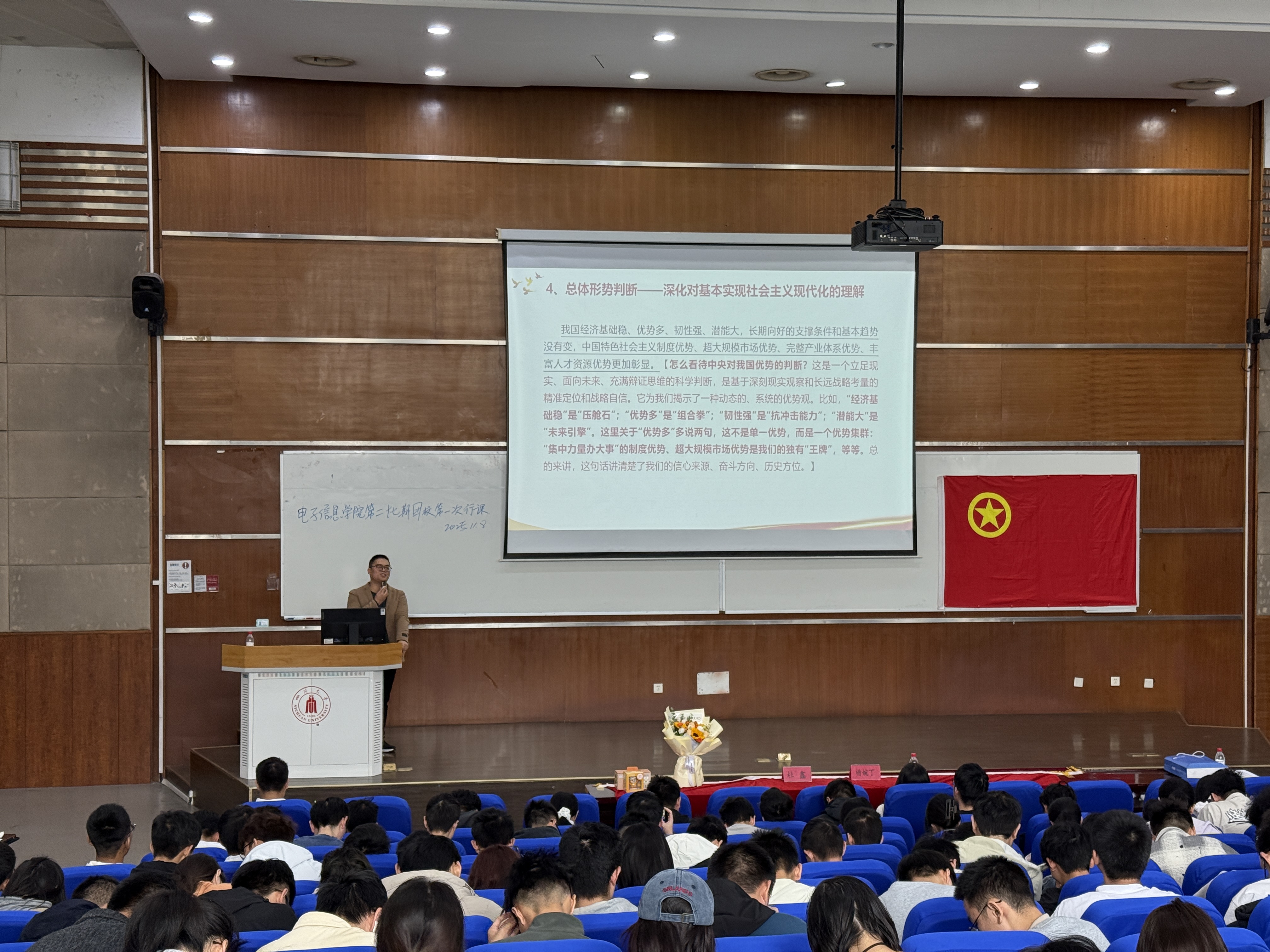 行课从全体奏唱团歌中拉开序幕,学生代表向诗艺从中国式现代化与青年责任、青年在历史与现实中的重要性等方面,鼓励各团员作为电子青年认真学习团校知识,关注芯片研发、通信技术等领域,助力国家科技自立自强。