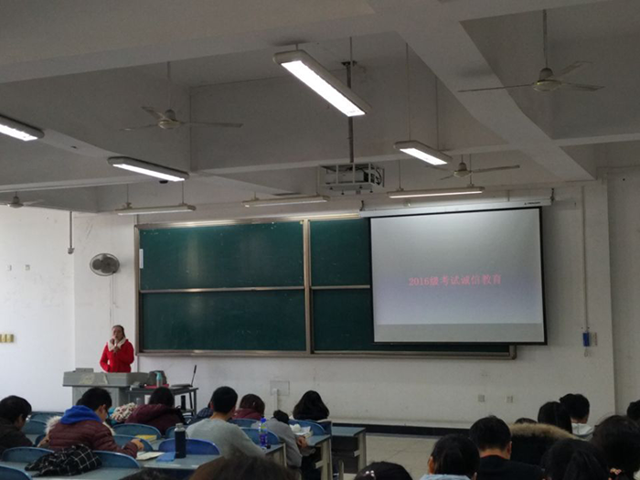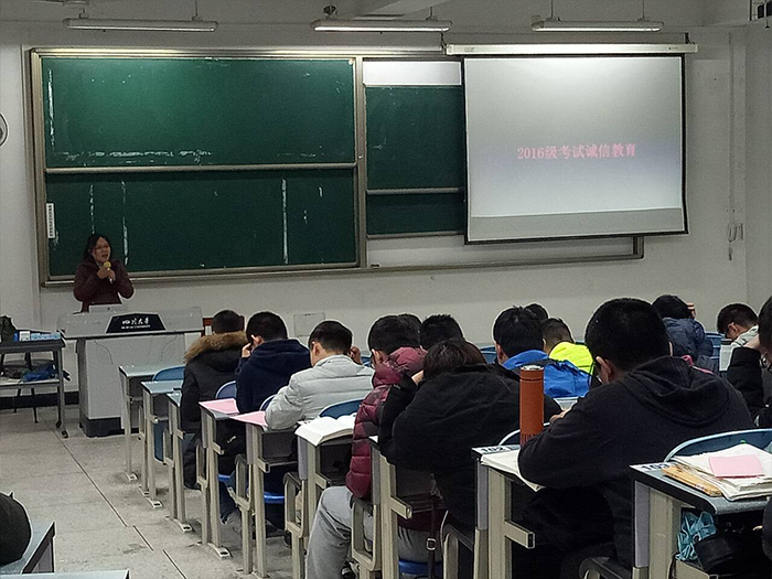 2017年12月15日星期五下午,在江安校区综合楼C座404教室和105教室,太阳集团tyc97287至10班,1至6班分别于下午2点30分和5点30分进行了2016级诚信考试教育课。太阳集团tyc97282016级辅导员陈晓娟老师和陈林老师分别主持。