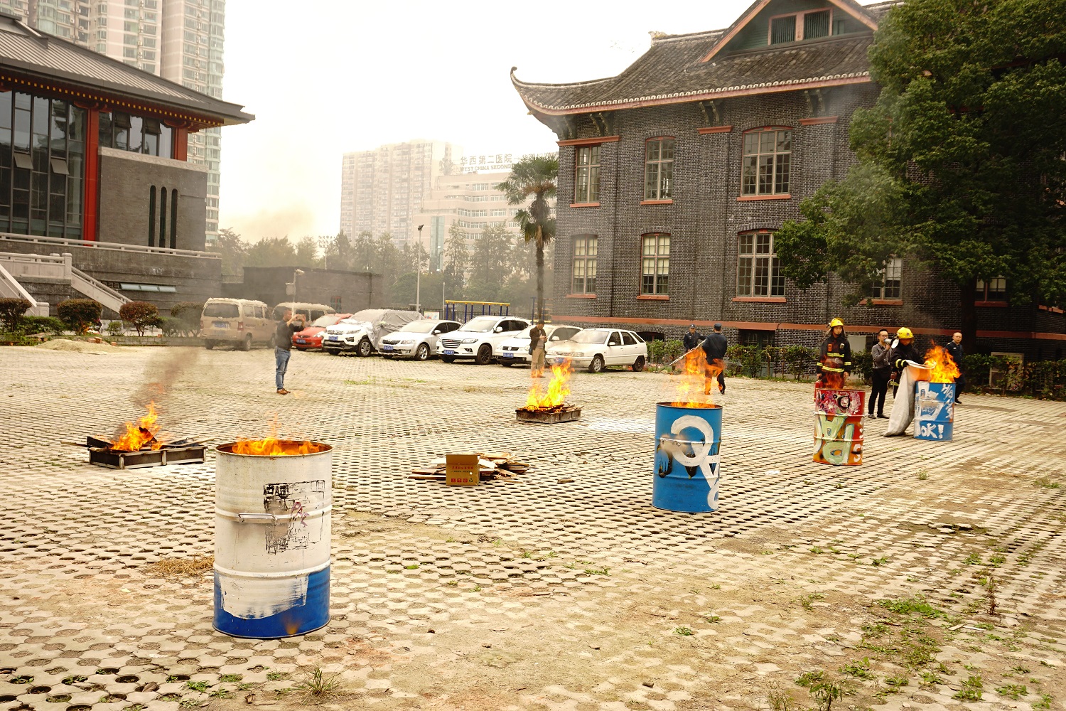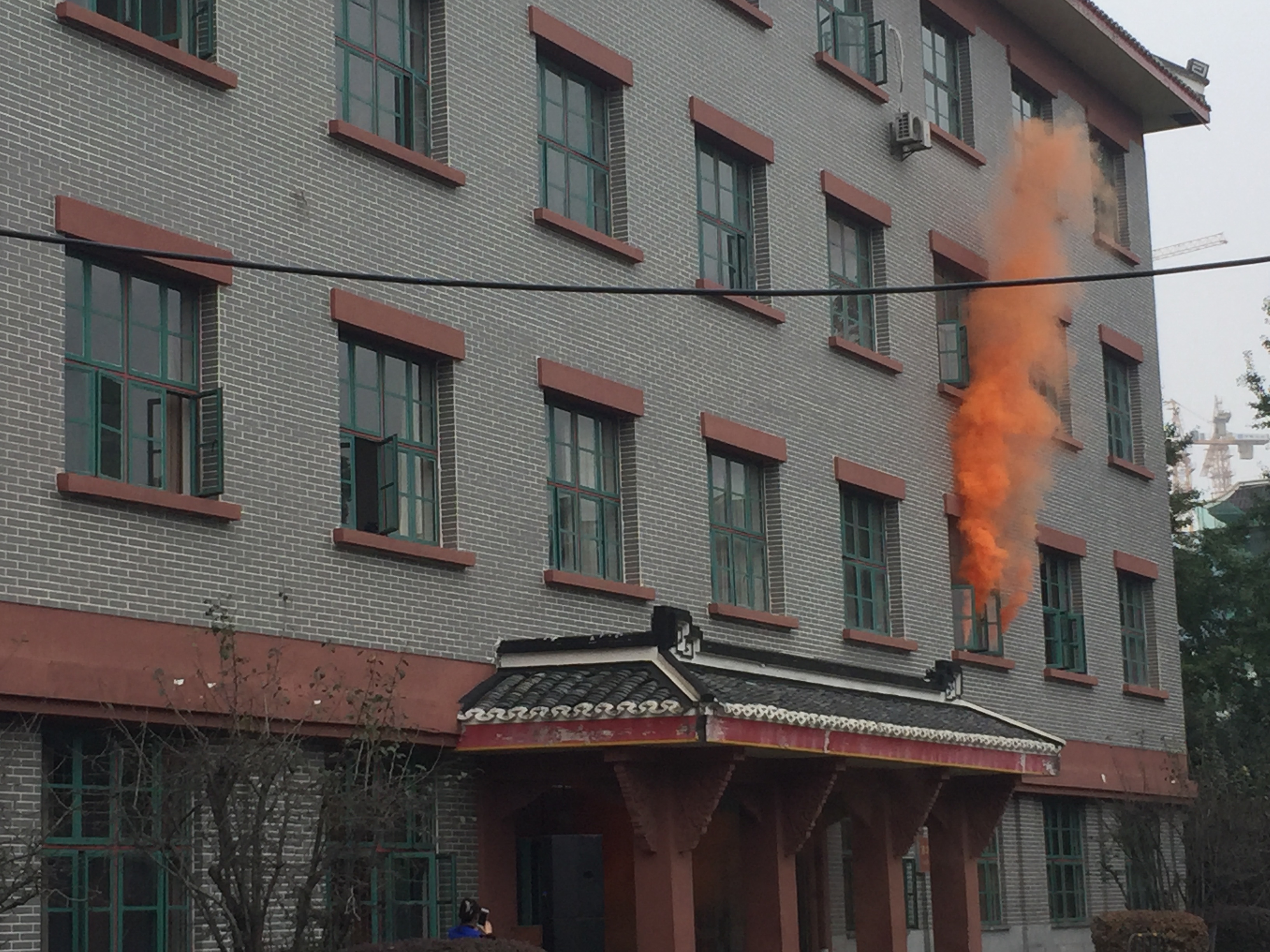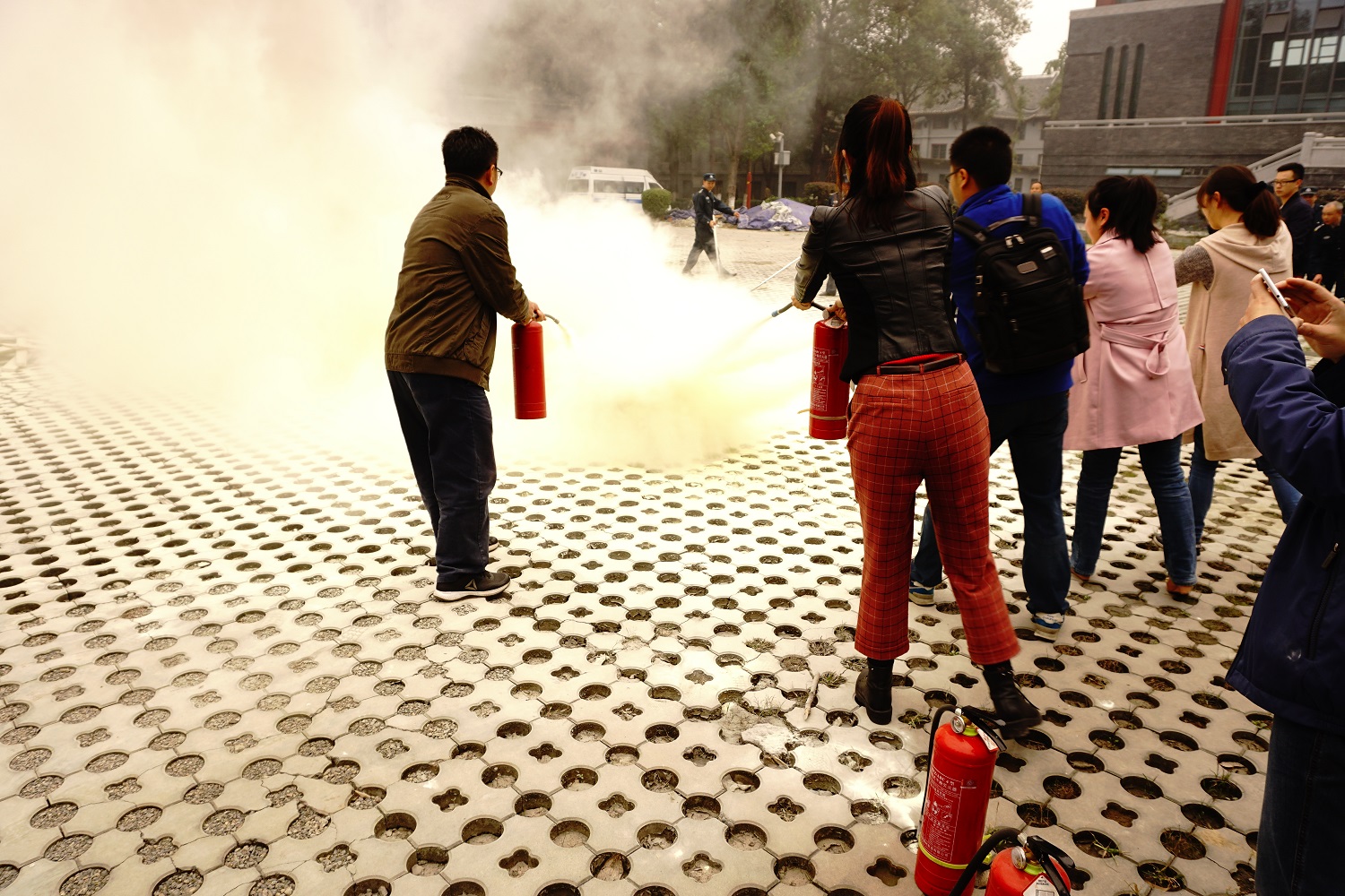 本次消防演习分为疏散逃生和灭火实操两部分。下午2时40分,演习正式开始。滚滚浓烟于第九教学楼二楼冒出,确认火情后,大楼值班员立即发出消防应急广播预警、打开逃生通道,火速拨打119报警电话。校保卫处应急救援小组第一时间赶到,完成了初期的火情侦查、人员疏散、伤员搜救和火场外围警戒工作。在保卫处及大楼工作人员的引导下,被困同学利用湿毛巾掩住口鼻,按照既定的消防逃离路线,低姿通过安全出口,快速而有秩序地逃离“火灾现场”。
